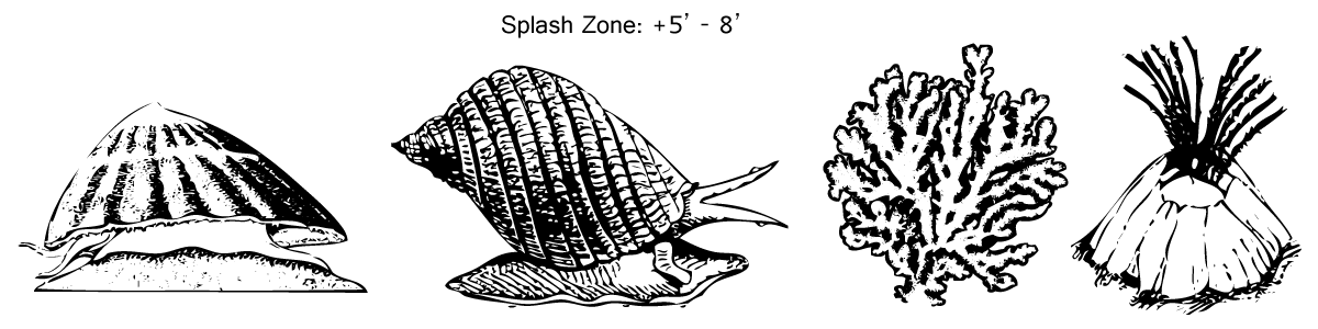 The splash zone receives a lot of spray from wave action but only gets submerged during storms.  To survive in this zone animals must deal with prolonged periods of direct sunlight, the potential beating of waves, and aerials attacks from birds.  Shield limpets, periwinkle snails, lichens, and barnacles can be found living here.