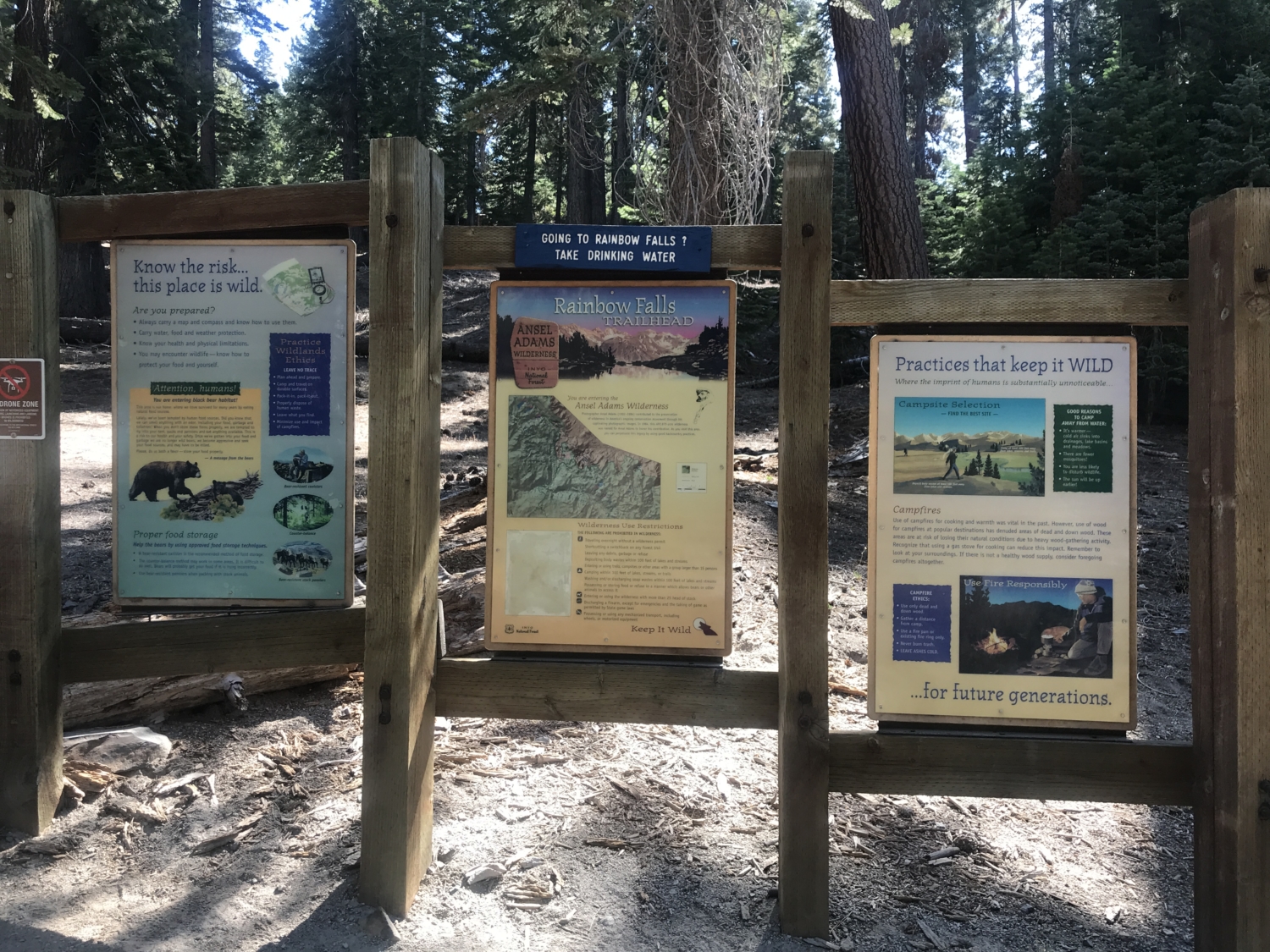 If you’re hiking the trail during the fall when the road is still open, but the shuttle is no longer required, you’ll want to grab your permit at the Mammoth Lakes Welcome Center in the morning, if possible, and jet down to the trailhead to get a parking spot before they all fill up. Some parking is available at the Rainbow Falls trailhead, but the overnight parking lot at Reds Meadow is a better option. Shockingly, Reds Meadow does not offer bear boxes to store food at the trailhead, to either throw away or bring your car snacks with you.