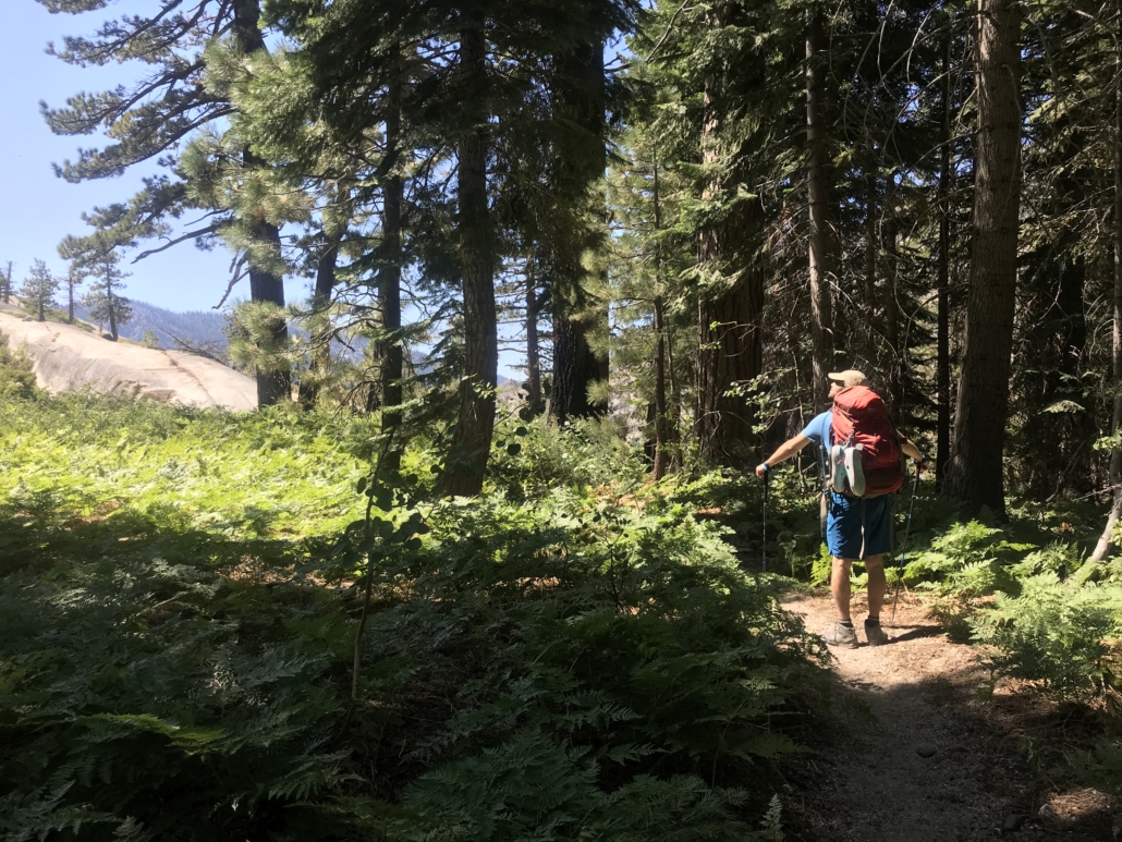 The trail will begin a long and gentle descent towards Crater Creek, passing nearby some really cool granite rock features. Verdant, green ferns line the more shady, wooded areas of trail, and prickly, red gooseberries burst out of the bushes everywhere you look.