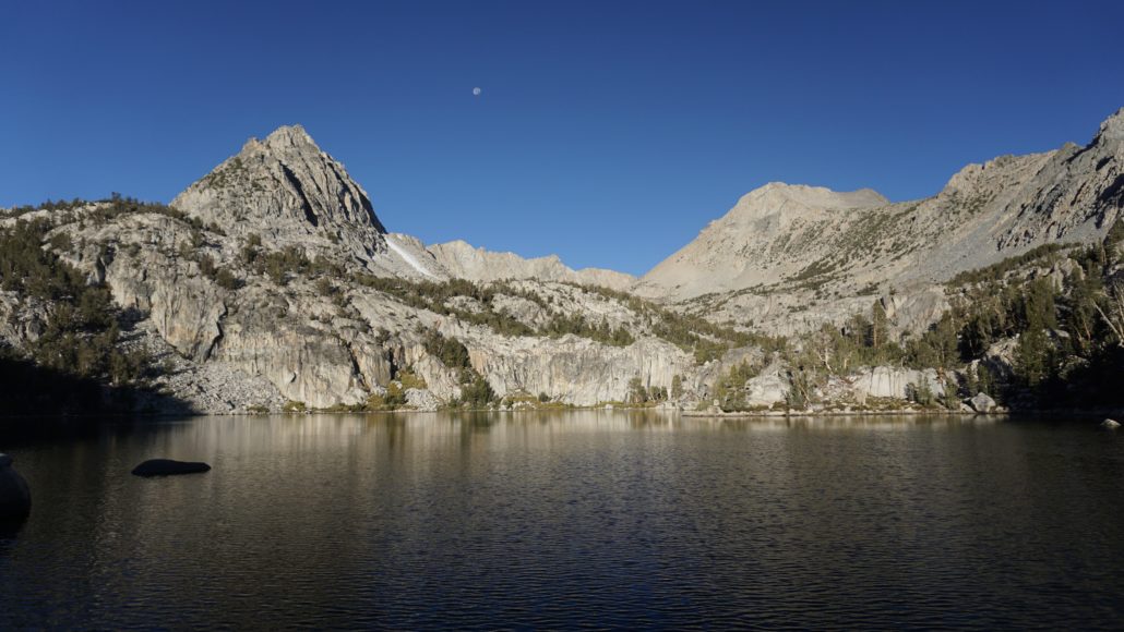 The trail becomes a bit more vague as it approaches the outlet of the upper lake. The view from the outlet is nice, but the views get better if you scramble up the broad ridge to your right. From atop that ridge, you can enjoy views over the entirety of the lake as well as some of the higher peaks on this corner of the Sierra Crest, including Mt. Lamarck. Also note the deep crease to the southwest. This is Lamarck Col, which mountaineers use as a means of shortcutting into Evolution Basin.