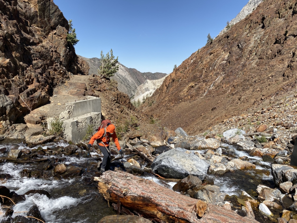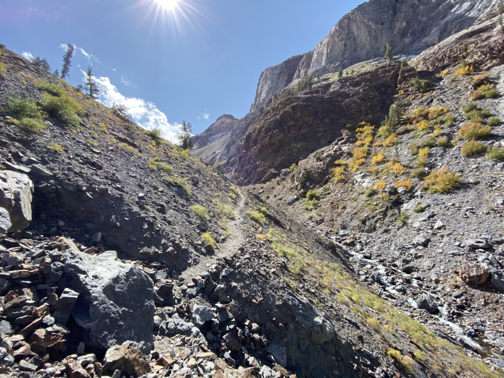 Around the 4-mile mark, you’ll come to the remains of a washed out bridge. In early summer months, you may be faced with a sketchy creek crossing that forces you to turn around at this point. In late summer and fall, however, the crossing is wide and fast, but relatively shallow and shouldn’t cause too much trouble if you bring your trekking poles. Hop from rock to rock to log as you make your way across the two intersecting streams, aiming for the cairns on the opposite side of the water.