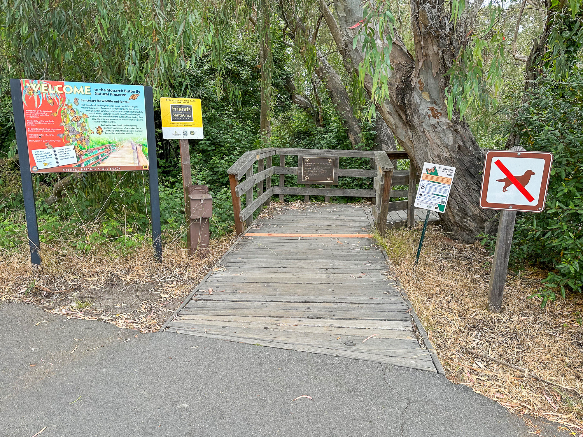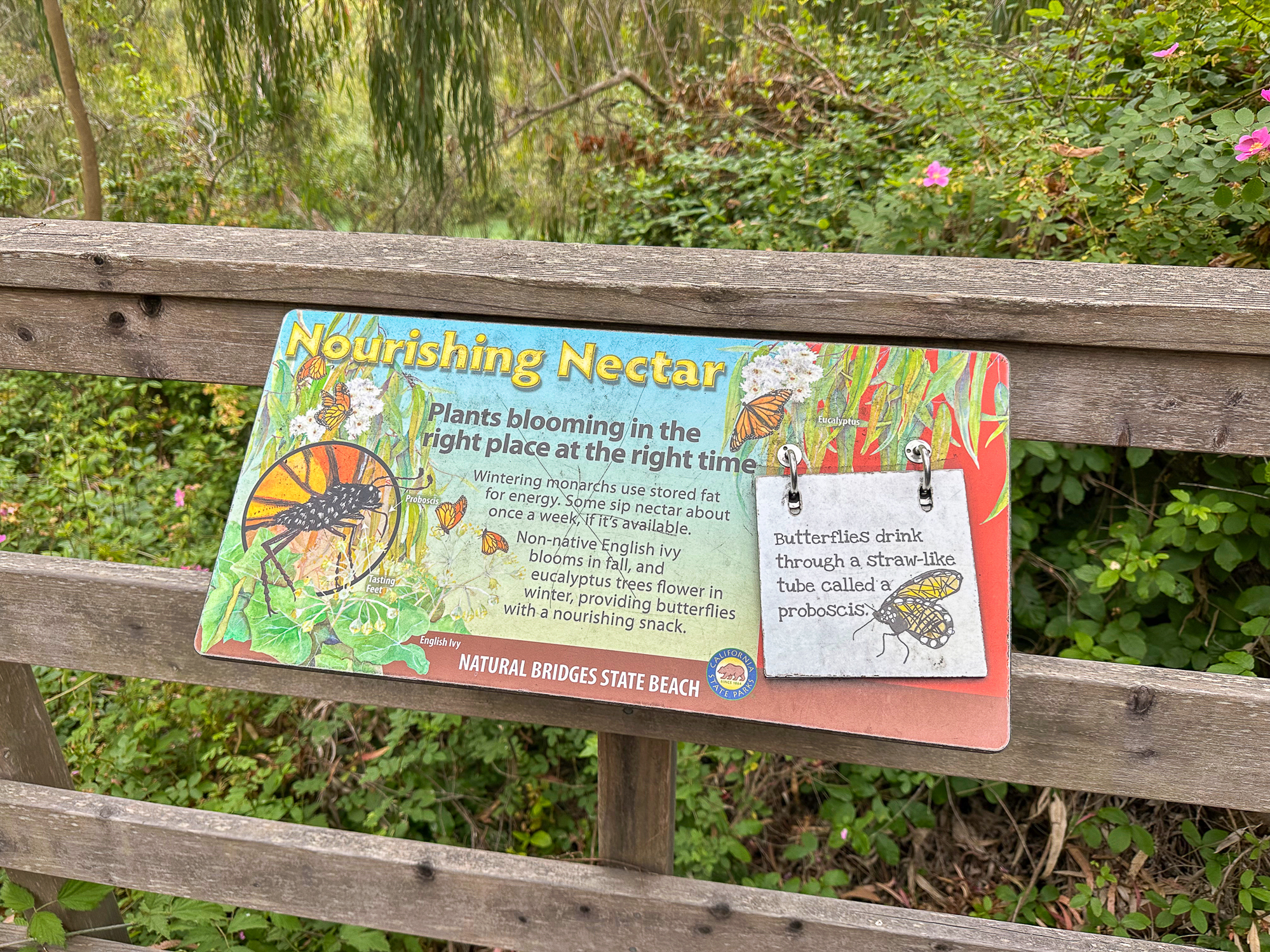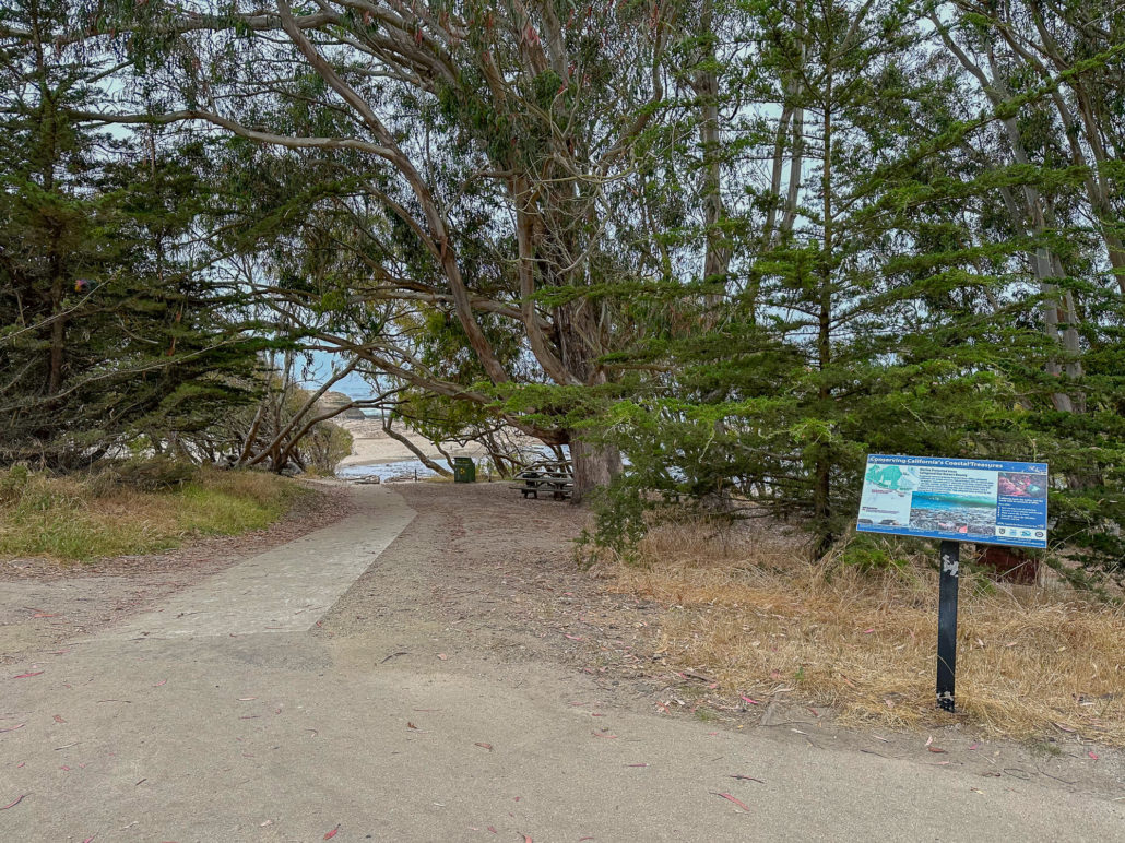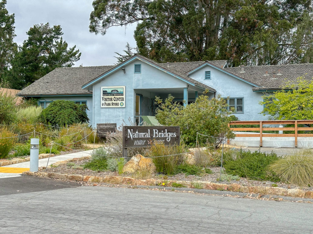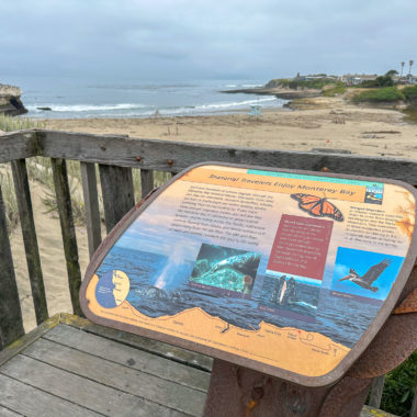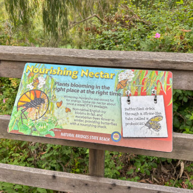 While this hike begins at the Monarch Preserve, it’s easy to switch it up and start with tide pooling if the timing works out more favorably. Beginning at the Natural Bridges Visitor Center, cross to the Monarch Butterfly Preserve sign and 5-foot wide accessible boardwalk under dense eucalyptus and patches of poison oak. Descend the stroller-friendly boardwalk, weathered and smooth, dotted with interpretive signs about the butterflies, plants, and wildlife.