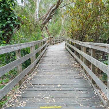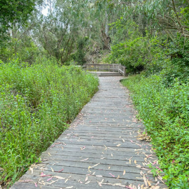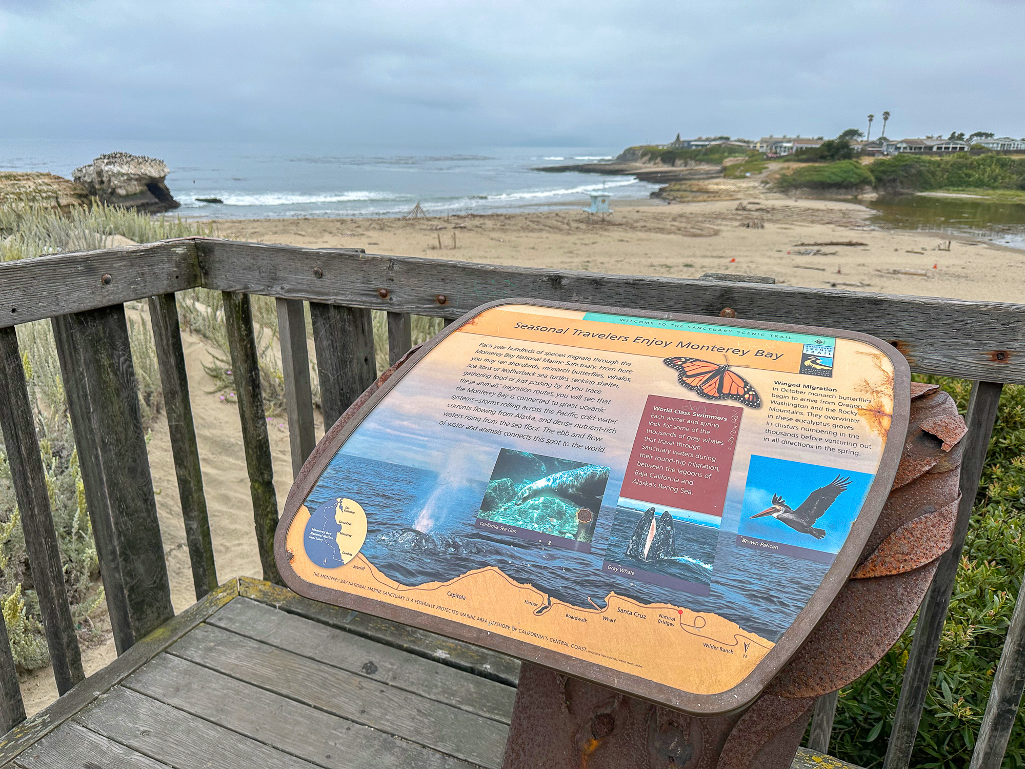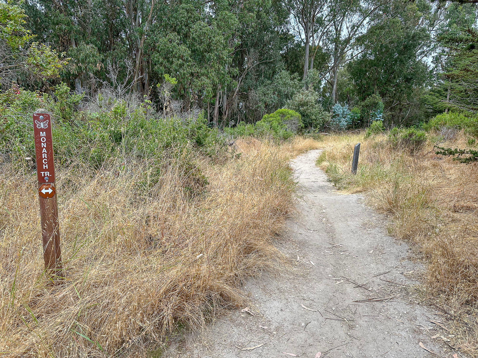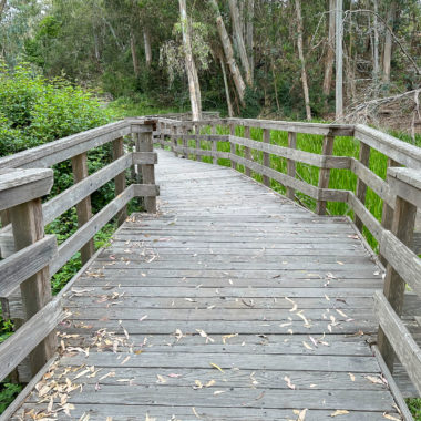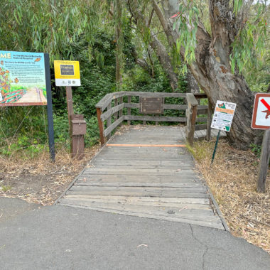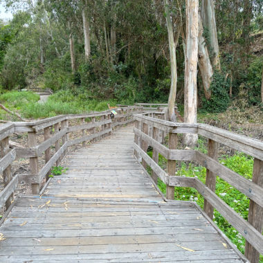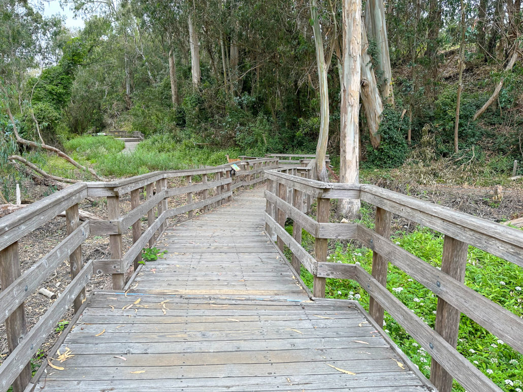 While this hike begins at the Monarch Preserve, it’s easy to switch it up and start with tide pooling if the timing works out more favorably. Beginning at the Natural Bridges Visitor Center, cross to the Monarch Butterfly Preserve sign and 5-foot wide accessible boardwalk under dense eucalyptus and patches of poison oak. Descend the stroller-friendly boardwalk, weathered and smooth, dotted with interpretive signs about the butterflies, plants, and wildlife.