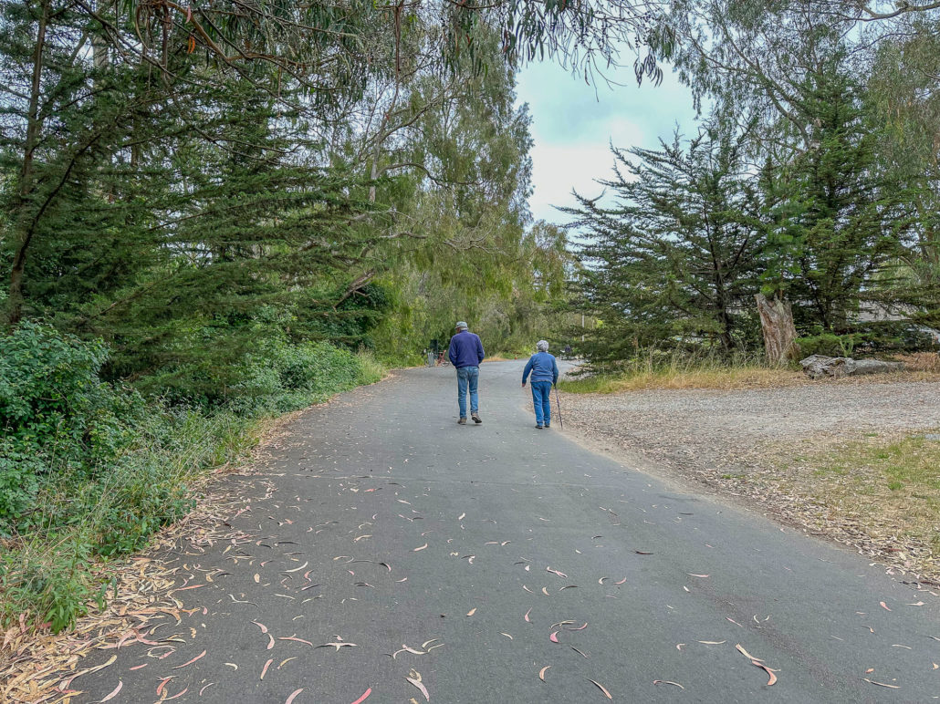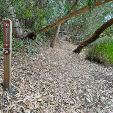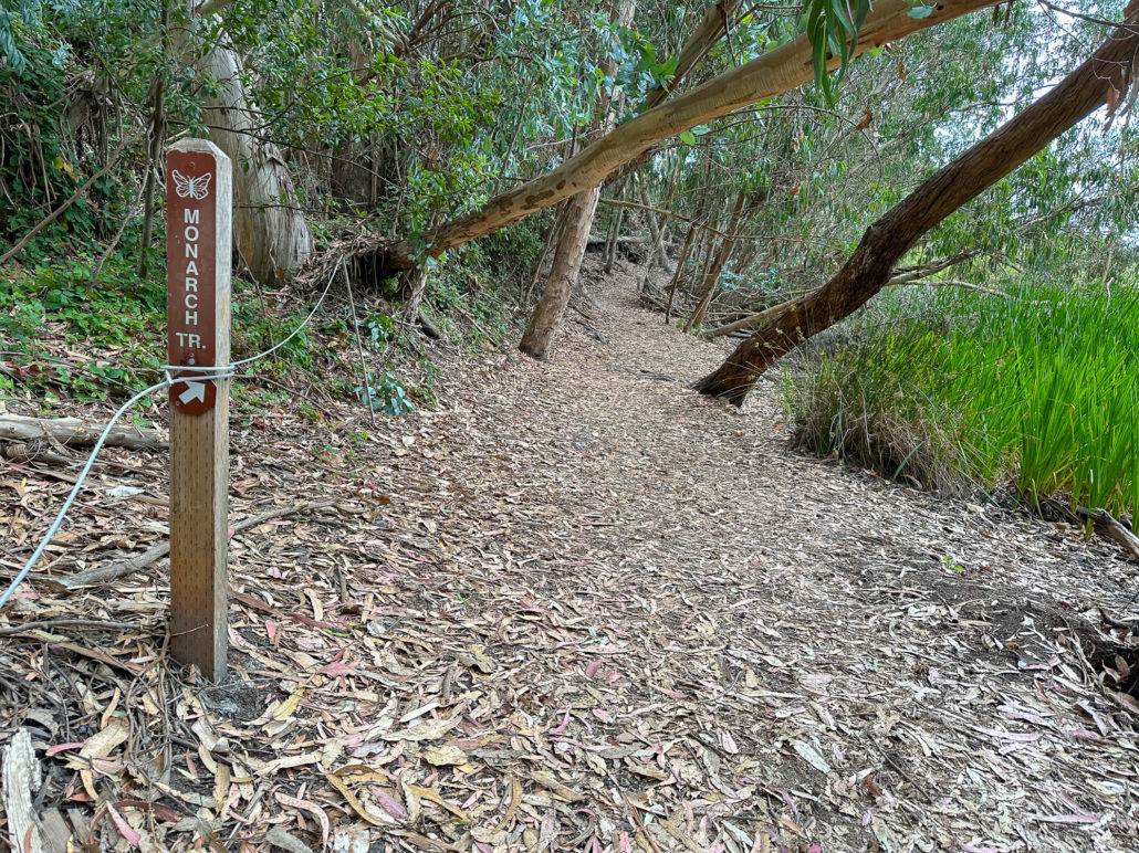 Eucalyptus trees provide shelter to the butterflies from rain and wind as well as a food source when the trees flower in winter. Look up and keep your eyes peeled for the Monarchs. They may be challenging to spot in cooler temperatures when they cling together and look like clusters of dead leaves. If the temperatures are warm enough, generally above 60 degrees, they become active, fluttering their orange wings around the canopy.