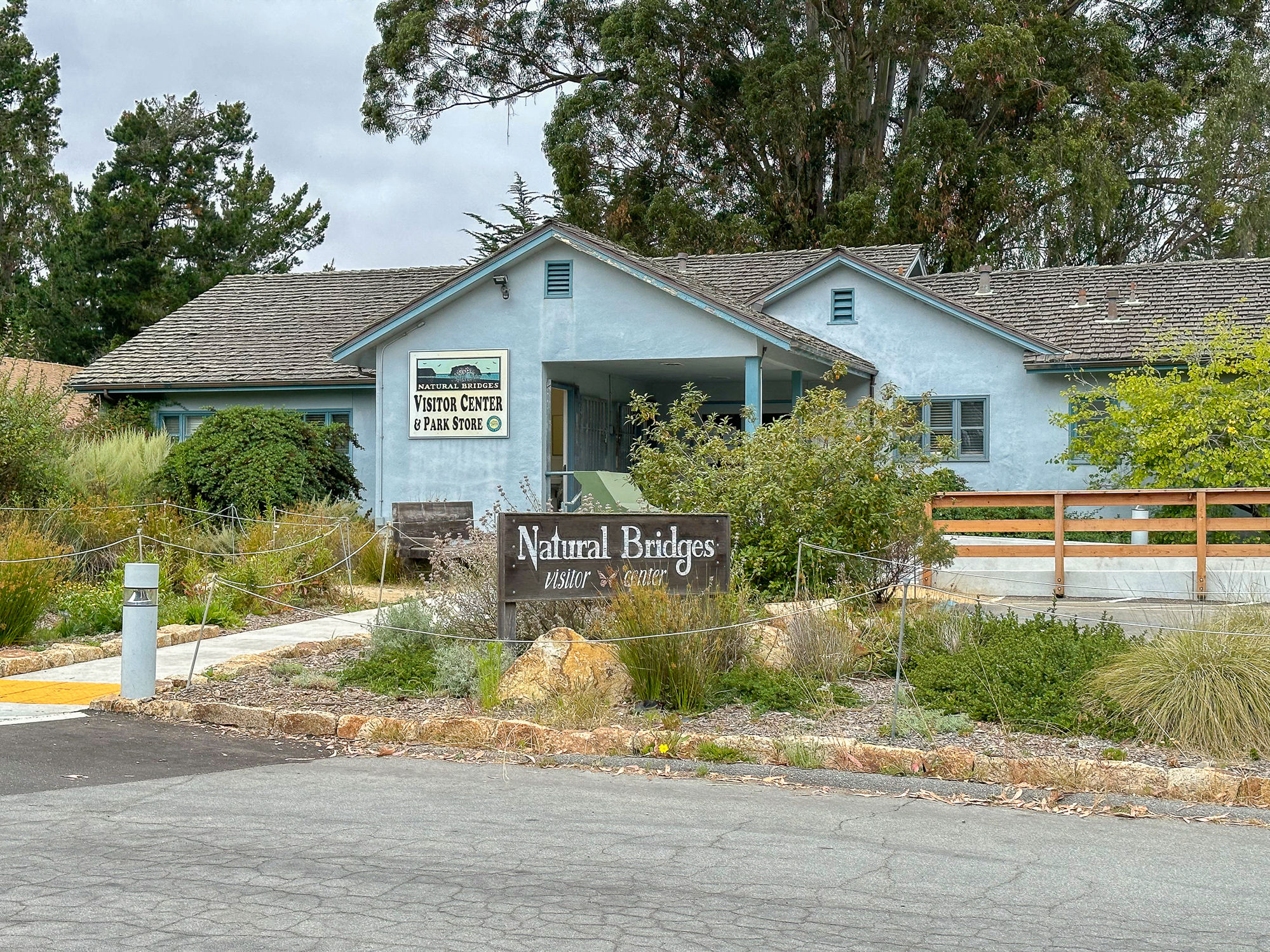 At the end of the boardwalk, turn right onto the Monarch Trail. Follow the moderately wide dirt trail north and then west around the forest to Natural Bridges Drive. Then, turn left onto Natural Bridges Drive, hiking south on the paved road back toward the visitor center.