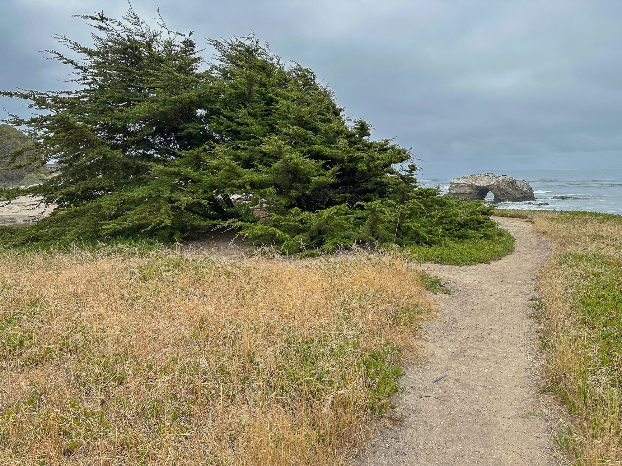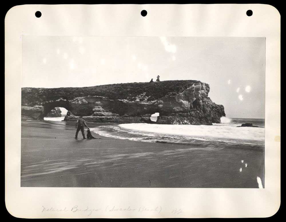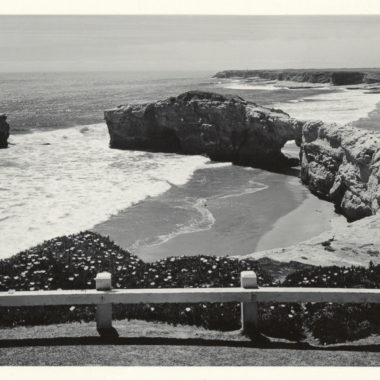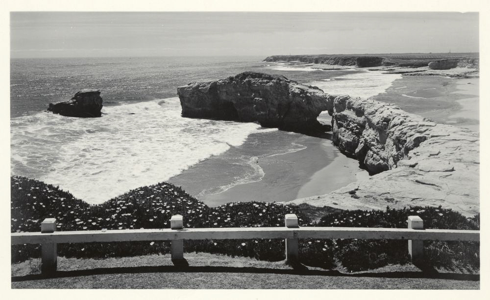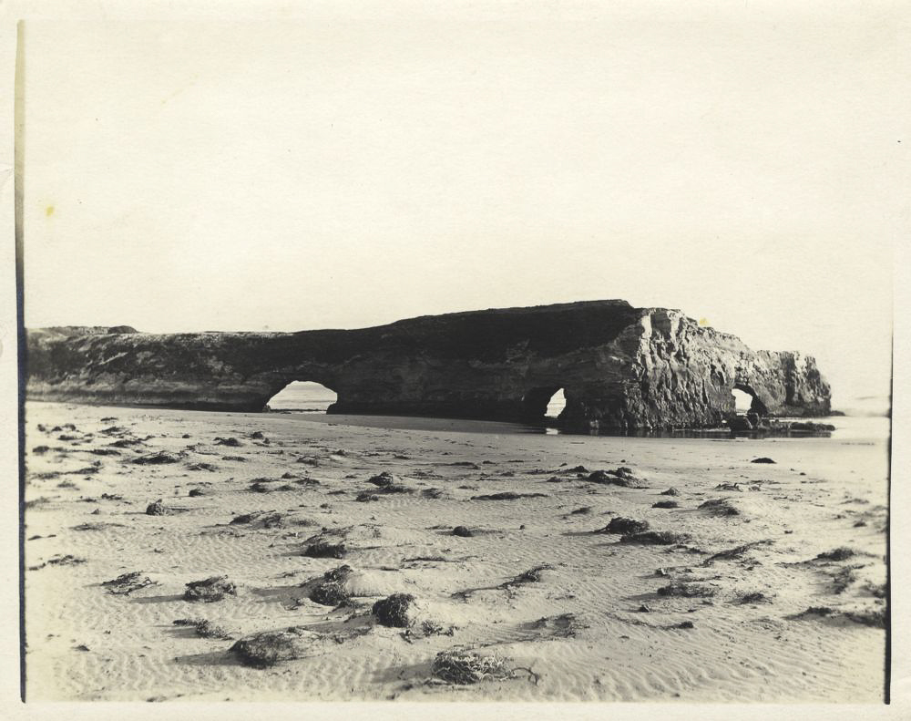 Just one natural, wave-carved arch is left out of the three original “bridges.” This remaining arch used to be the middle arch. The outermost arch beyond it fell in the early 1900s. The innermost arch, between the middle arch and the rocky promontory in front of you, collapsed in a 1980 storm. The historic photo below, courtesy of the University of California, Santa Cruz, was taken between 1940 and 1960 and shows the innermost arch intact. The middle arch is just beyond it, although it’s a little tricky to see. You can also spot the gap where the outer arch used to be.