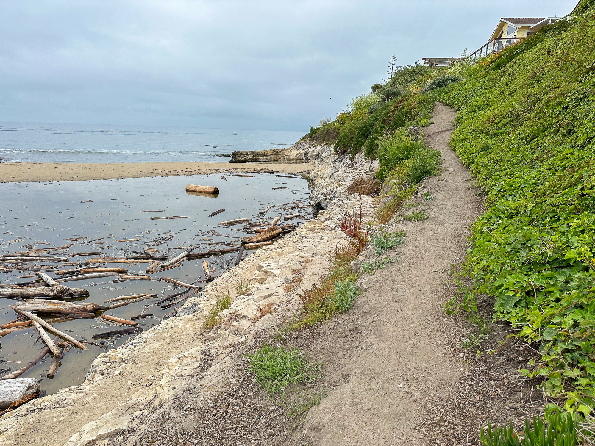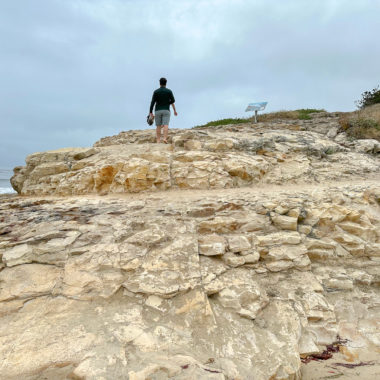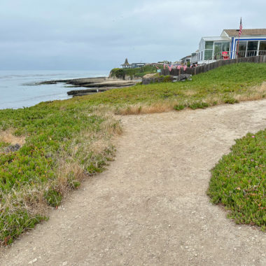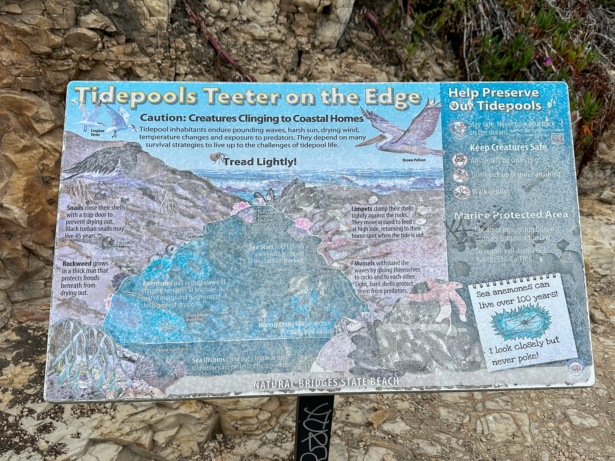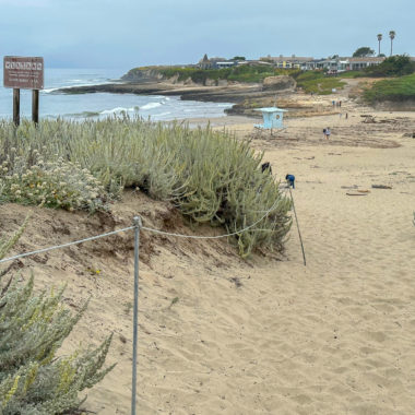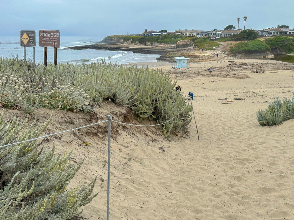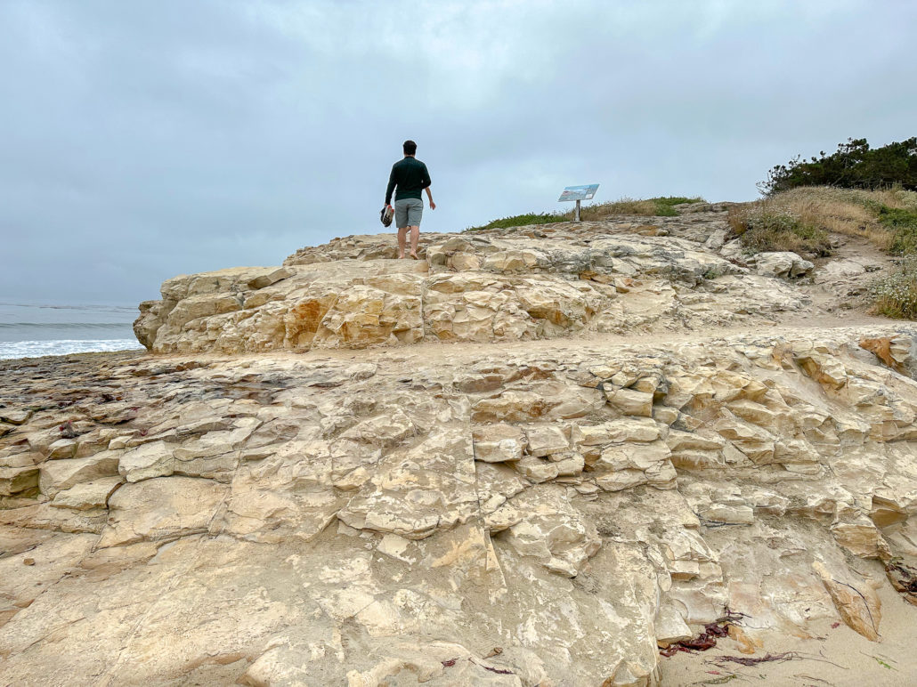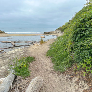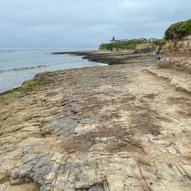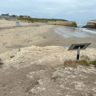 When ready, continue to the western side of the beach and climb up the rocky shelves. You can do some tide pooling on these shelves, and see creatures like anemones at low tide. However, for a more in-depth tide-pooling experience, find the footpath near the interpretive sign. Follow it to a gate at the De Anza Santa Cruz mobile home community, where public access trails lead through the community to more tide pools.