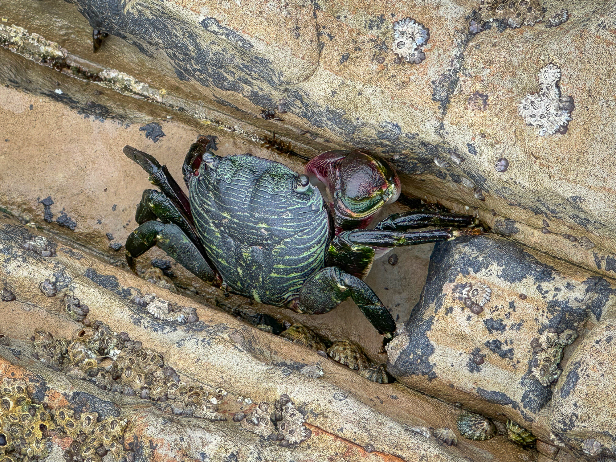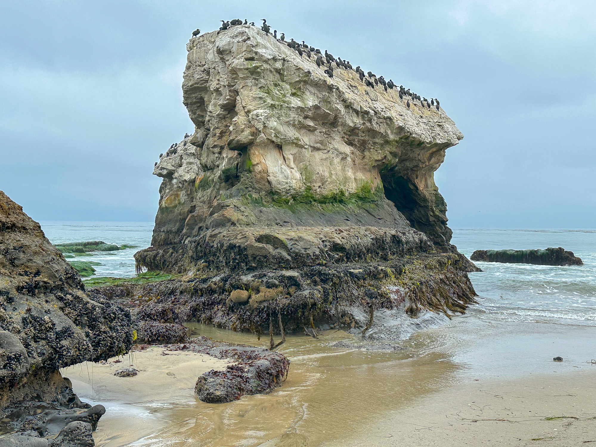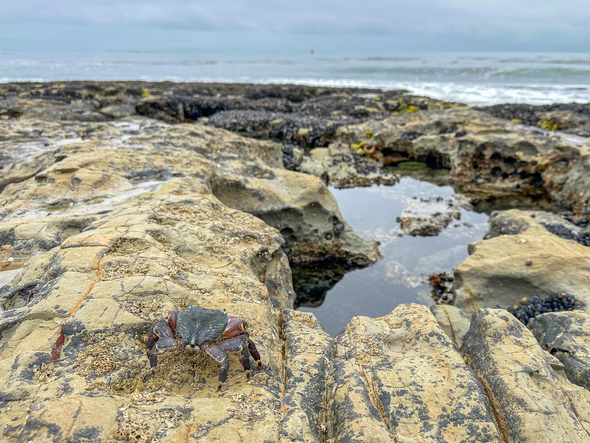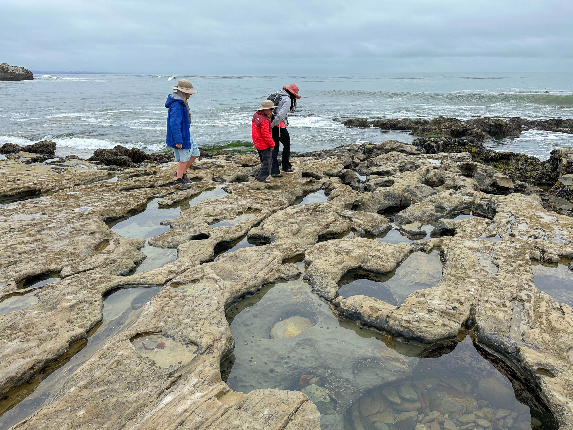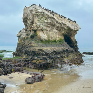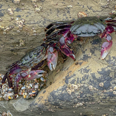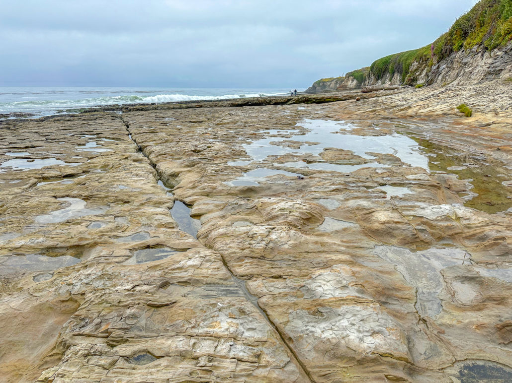 Hundreds of small pools dot the shelves at low tide, filled with green, blue, yellow, and purple anemones, scampering crabs, clinging mussels and limpets, and purple and red sea stars. Please take care where you step, for your safety and to protect the fragile sea life clinging to the rocks: a protected part of the Monterey Bay National Marine Sanctuary.