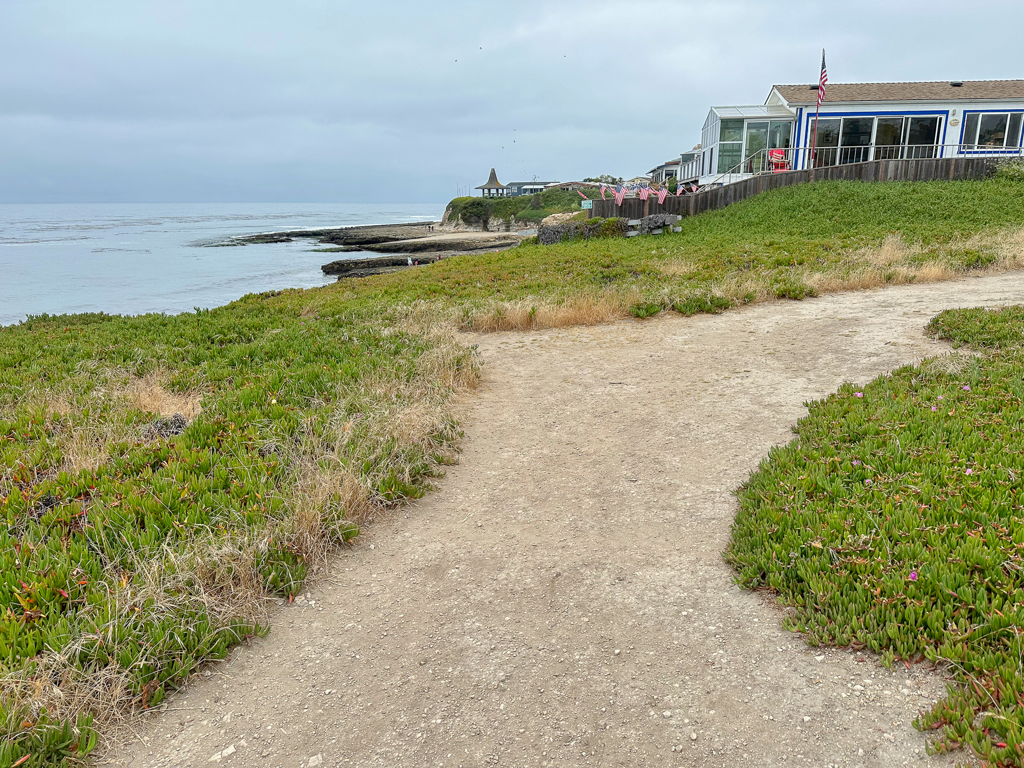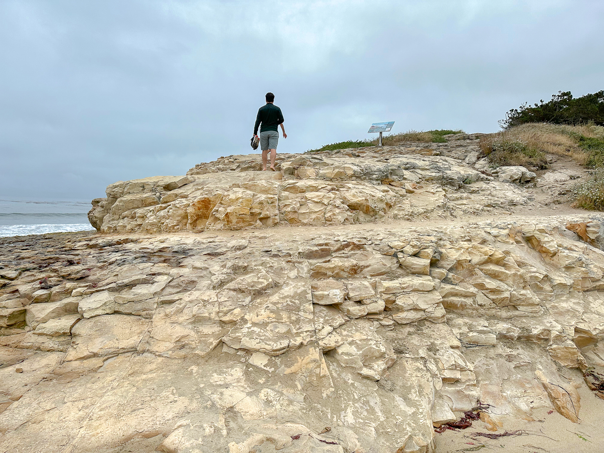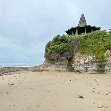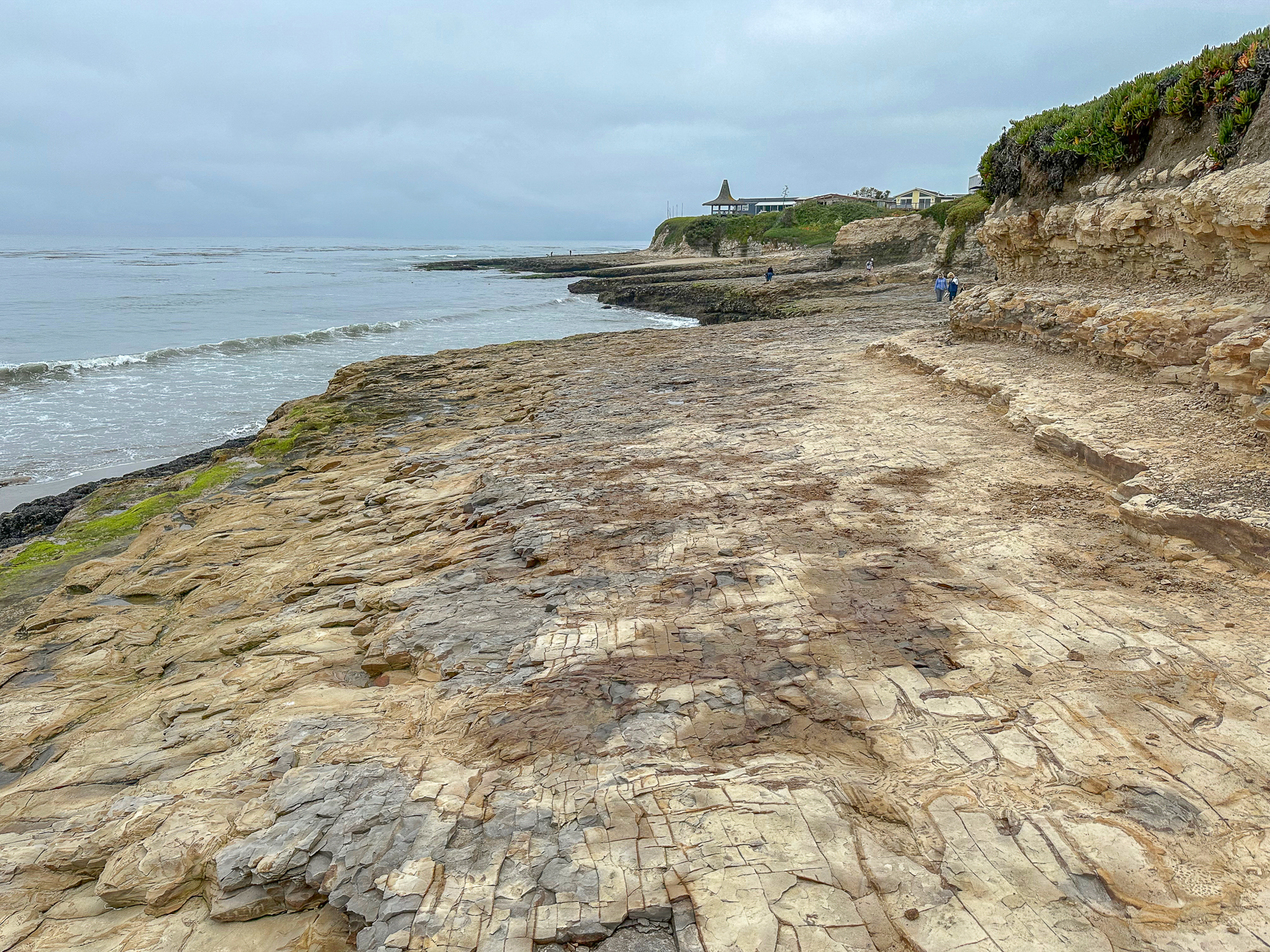 On the western side of the beach, find a narrow dirt trail and take it up the cliff. Pass under a gazebo to the wide rock shelves.