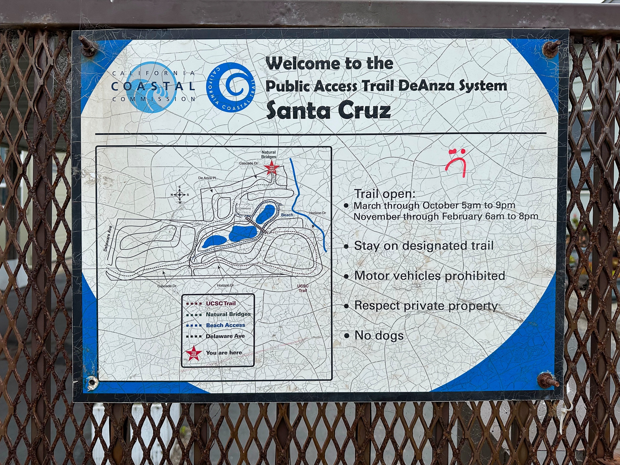 Natural Bridges is open from 8:00 a.m. to sunset. Dogs are allowed in the parking lots and picnic areas, but they are not allowed on the beach, trails, or in the butterfly preserve, with the exception of service dogs.