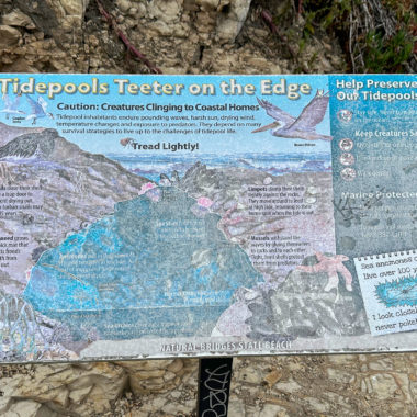 Check the tide forecast for Natural Bridges here on the National Oceanic and Atmospheric Administration’s Tides and Currents site. Low tides and minus tides—tides below zero that are really good for tide pooling—generally occur in the afternoon and early evening in fall and winter at Natural Bridges.