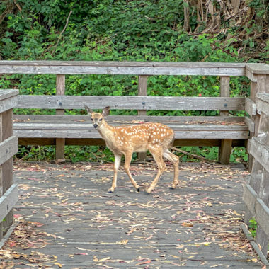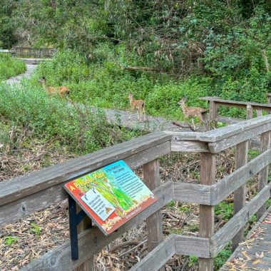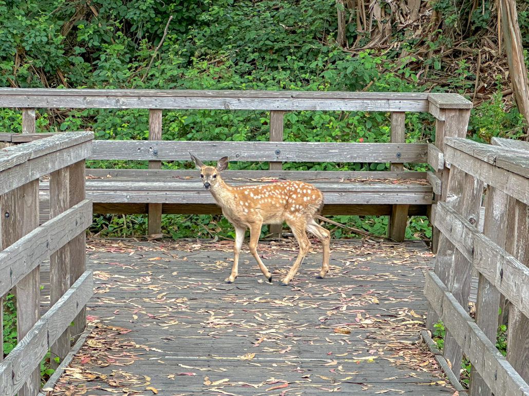 A deer family on the boardwalk in the butterfly preserve