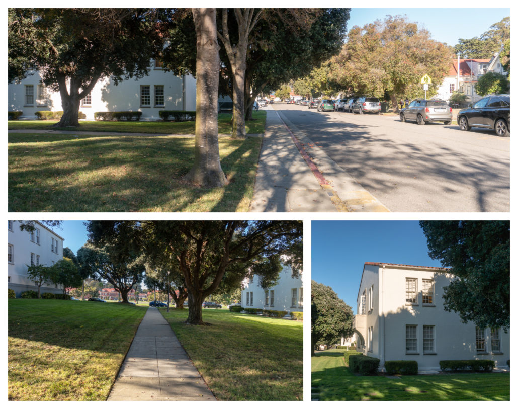 After crossing Mesa, turn right onto the sidewalk. In 100 feet, turn left onto another sidewalk between the white concrete buildings with red tile roofs. Building 39 on your left and Building 38 on your right were built in 1940 as part of the Works Progress Administration. Their Mission style white walls and red tile roofs are a nod to the Presidio’s Spanish history. After World War II, Building 38 became the headquarters for the Sixth U.S. Army, who oversaw the deployment of Army Reserve Units to the Korean and Vietnam Wars.