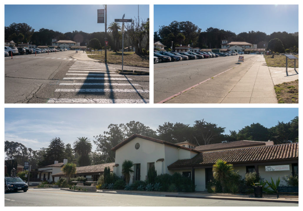 After admiring the buildings, turn left onto the sidewalk along Keyes Avenue. In 125 feet, turn right onto a crosswalk to cross Keyes Avenue, Graham Street, and Anza Avenue towards the small, white, square building with a red tile roof—congrats! You have made it to Tree Fall!