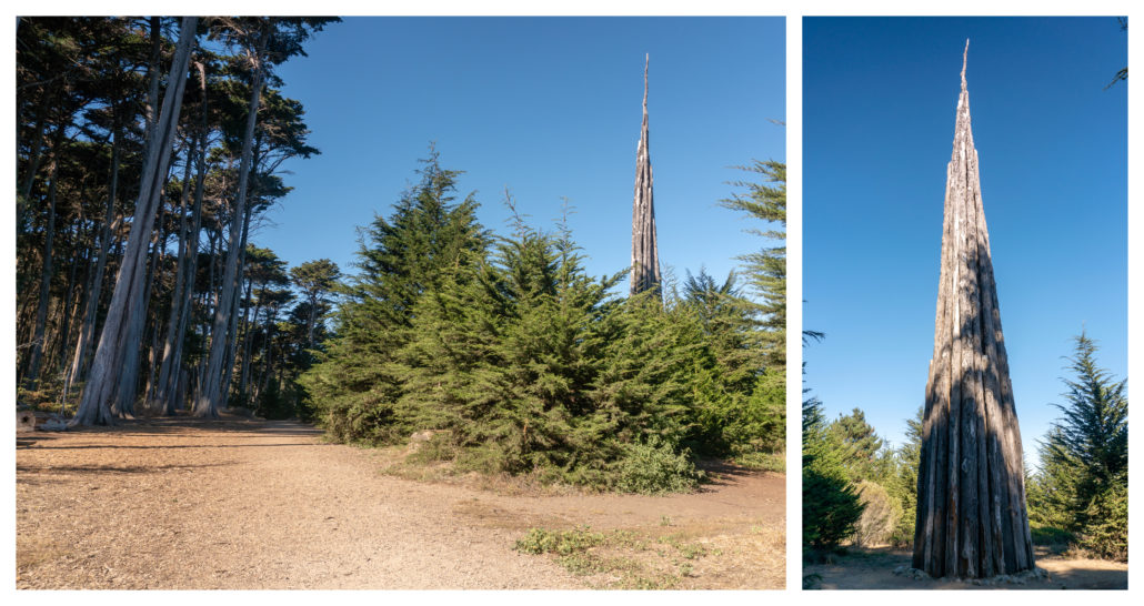 Arrive at Inspiration Point at the 0.7-mile mark to views of Angel Island, the San Francisco Bay, Alcatraz, and the Palace of Fine Arts. When ready, take the sidewalk along Arguello Boulevard south towards the Presidio Golf Course. Cross Arguello Boulevard on the crosswalk, then turn right onto the Bay Area Ridge Trail. Hike 500 feet northwest to reach Spire, the second sculpture on this hike at the 1.0-mile mark.