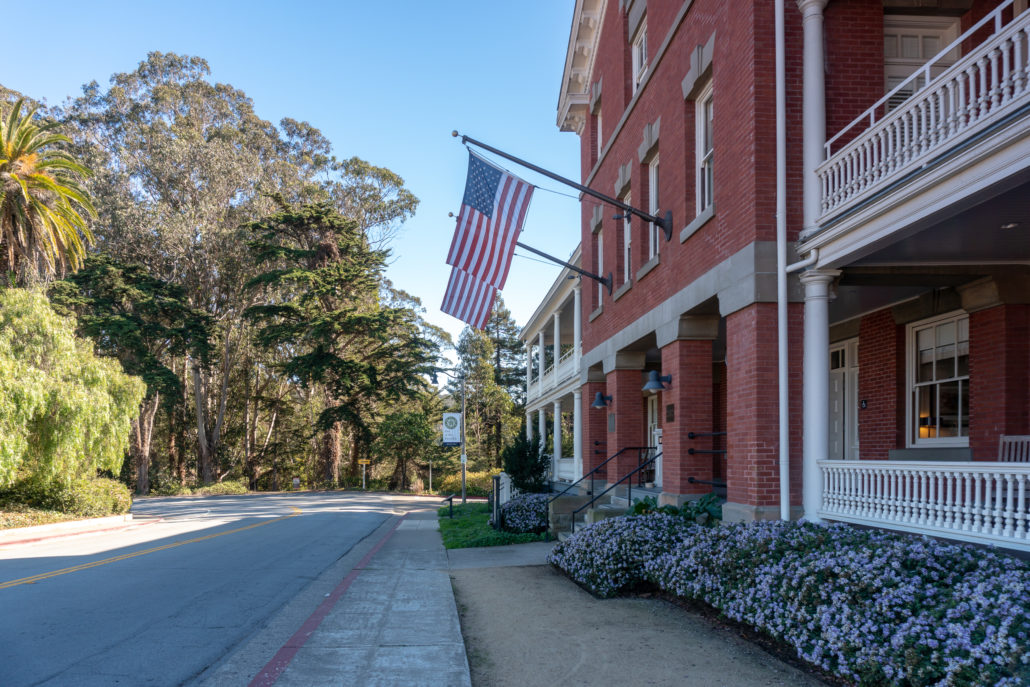 Now that you have seen Earth Wall, step back out into the sunshine and turn right on Moraga Avenue. Head southeast towards the Inn at the Presidio, a red brick building built in 1903 that opened as a hotel in 2012. The Inn was the first hotel in the Presidio, and during the U.S. military base period was the former sleeping quarters for unmarried military officers.