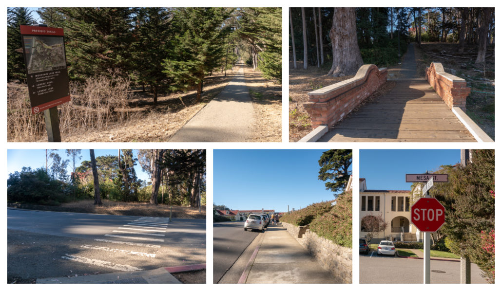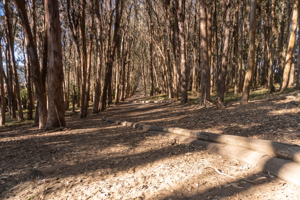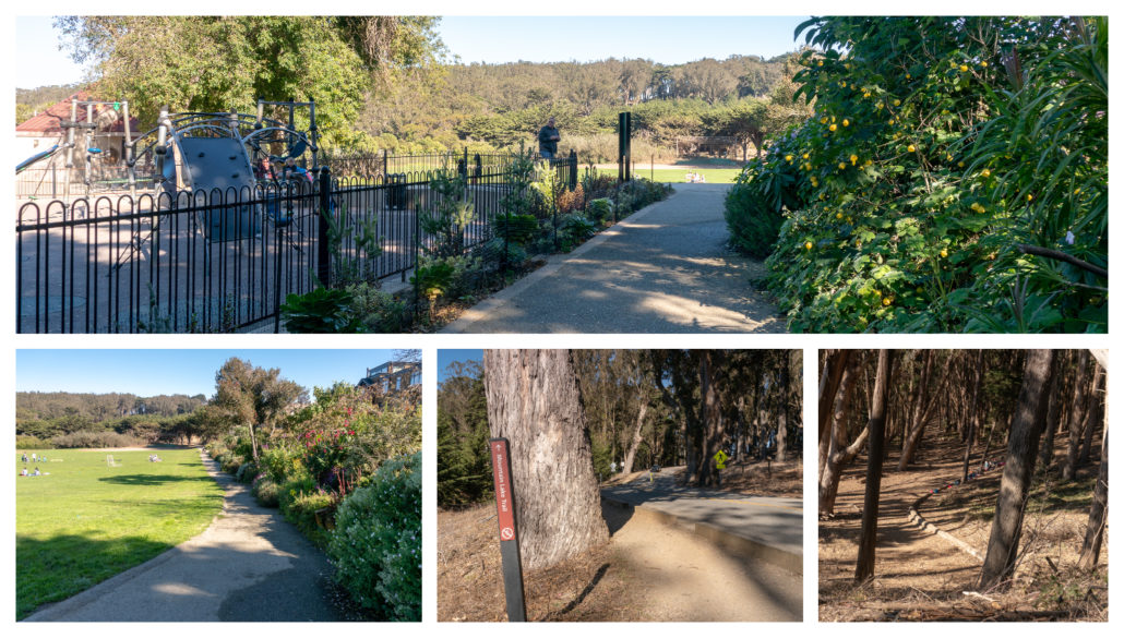 Enjoy the gentle 100-foot descent among eucalyptus, arriving at a colorful explosion of flowers at the Julius Kahn Playground. Beyond the playground is a great big field, a nice spot for a picnic or a rest. Continue east on the trail next to the field, climbing 100 feet next to West Pacific Avenue. Pop out at a tiny parking space that’s an alternative trailhead—see Notes below—and stay left onto the shoulder of West Pacific Avenue. Cross the Lovers’ Lane trail to an overlook for Wood Line at the 1.8 mile-mark.