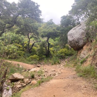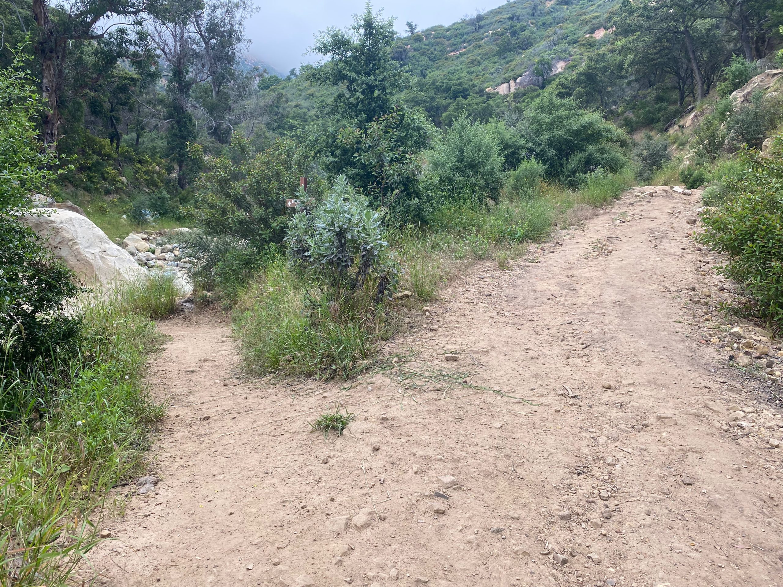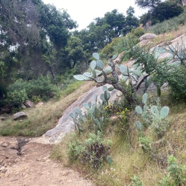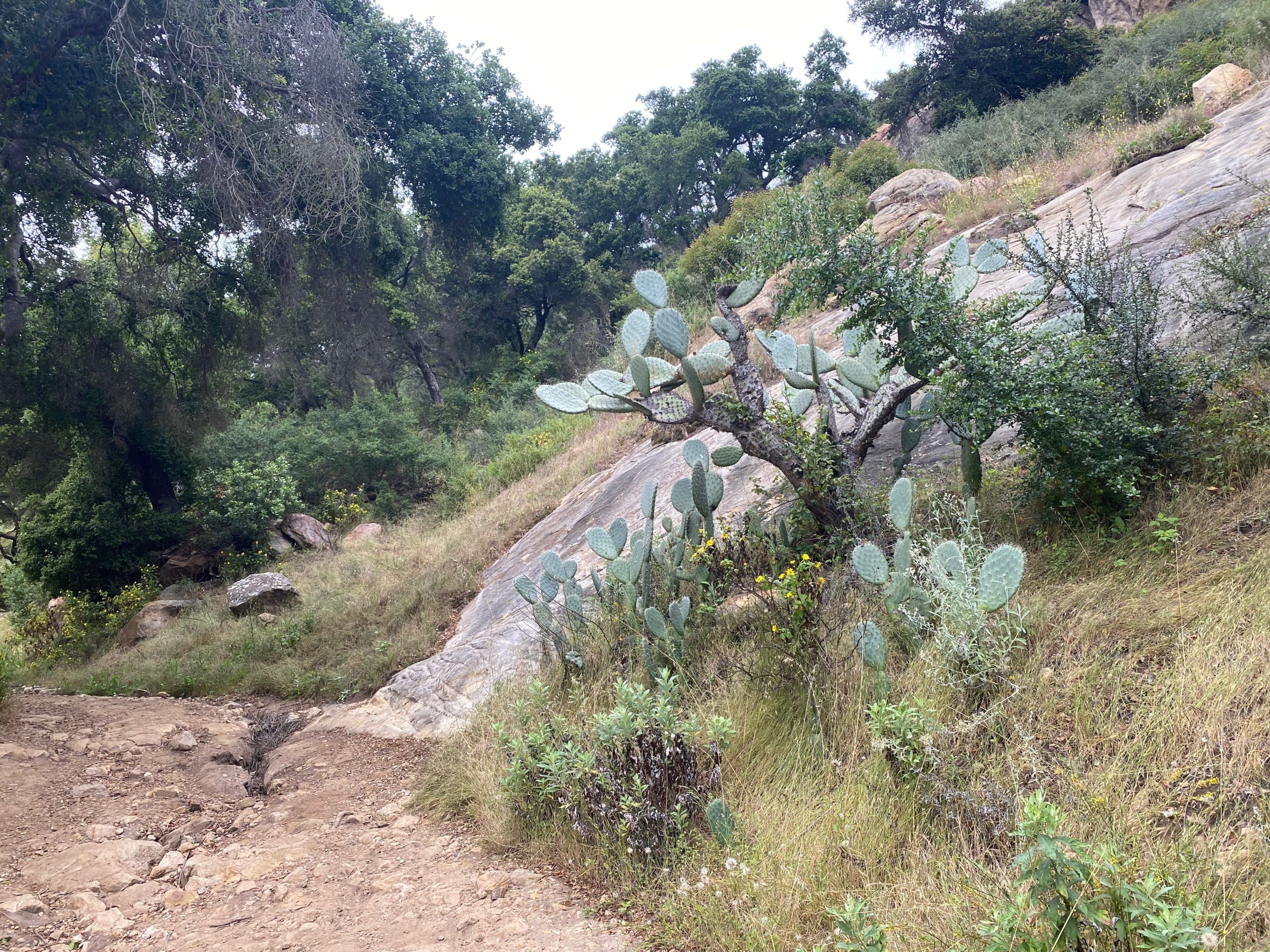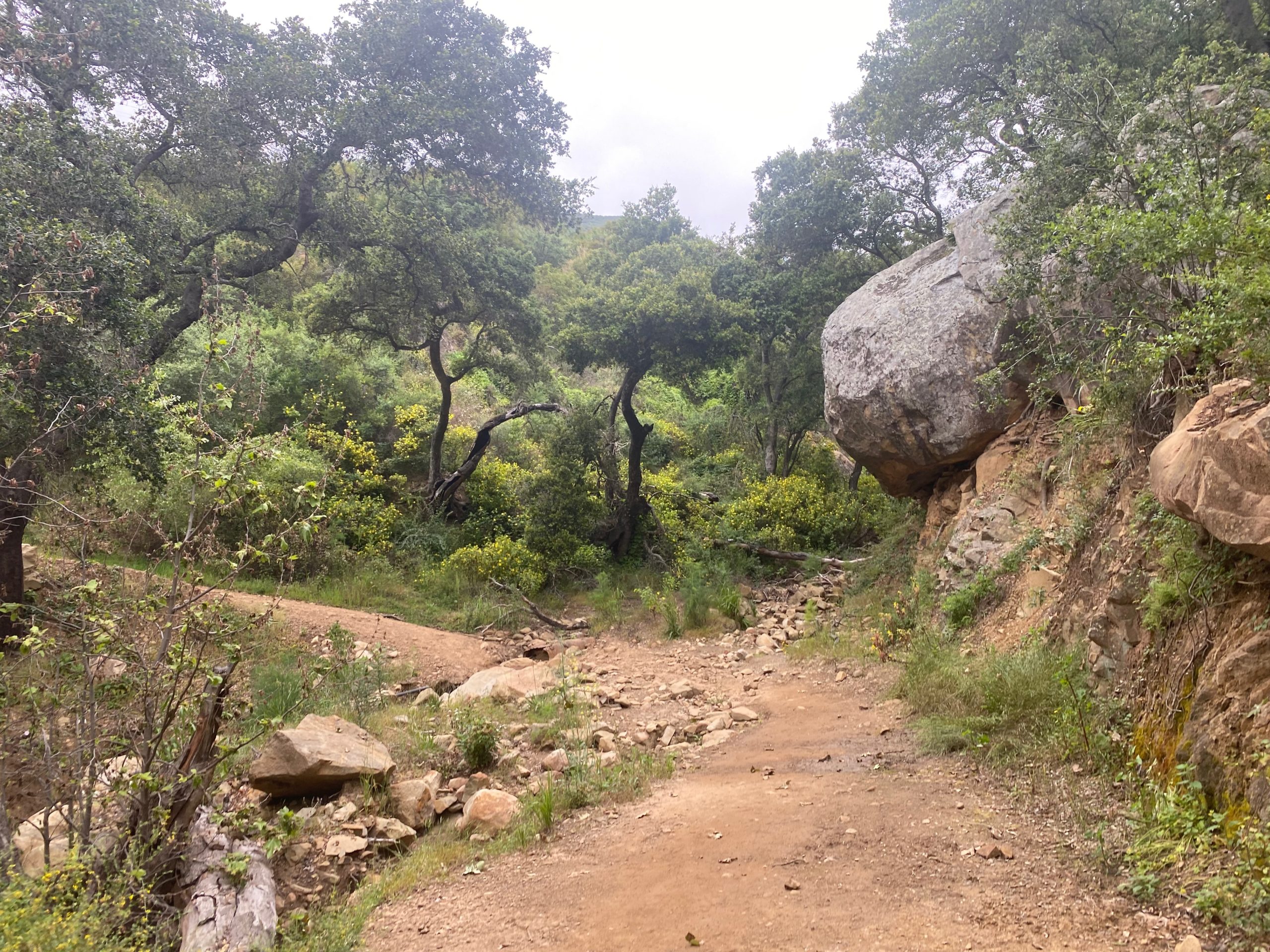 You’ll start to notice a fairly steady incline at this point, but it’s gradual and not too bad. Depending on what time of year you go, expect a bit of mud on various points, as there’s several creek “crossings” (they’re small, easy, and were fairly dry when I went in May) along the way. After a little while, you’ll notice San Ysidro Rock, a popular climbing destination, on your left.