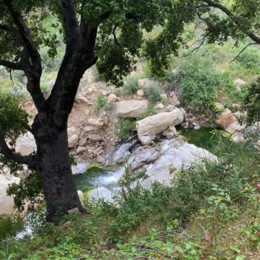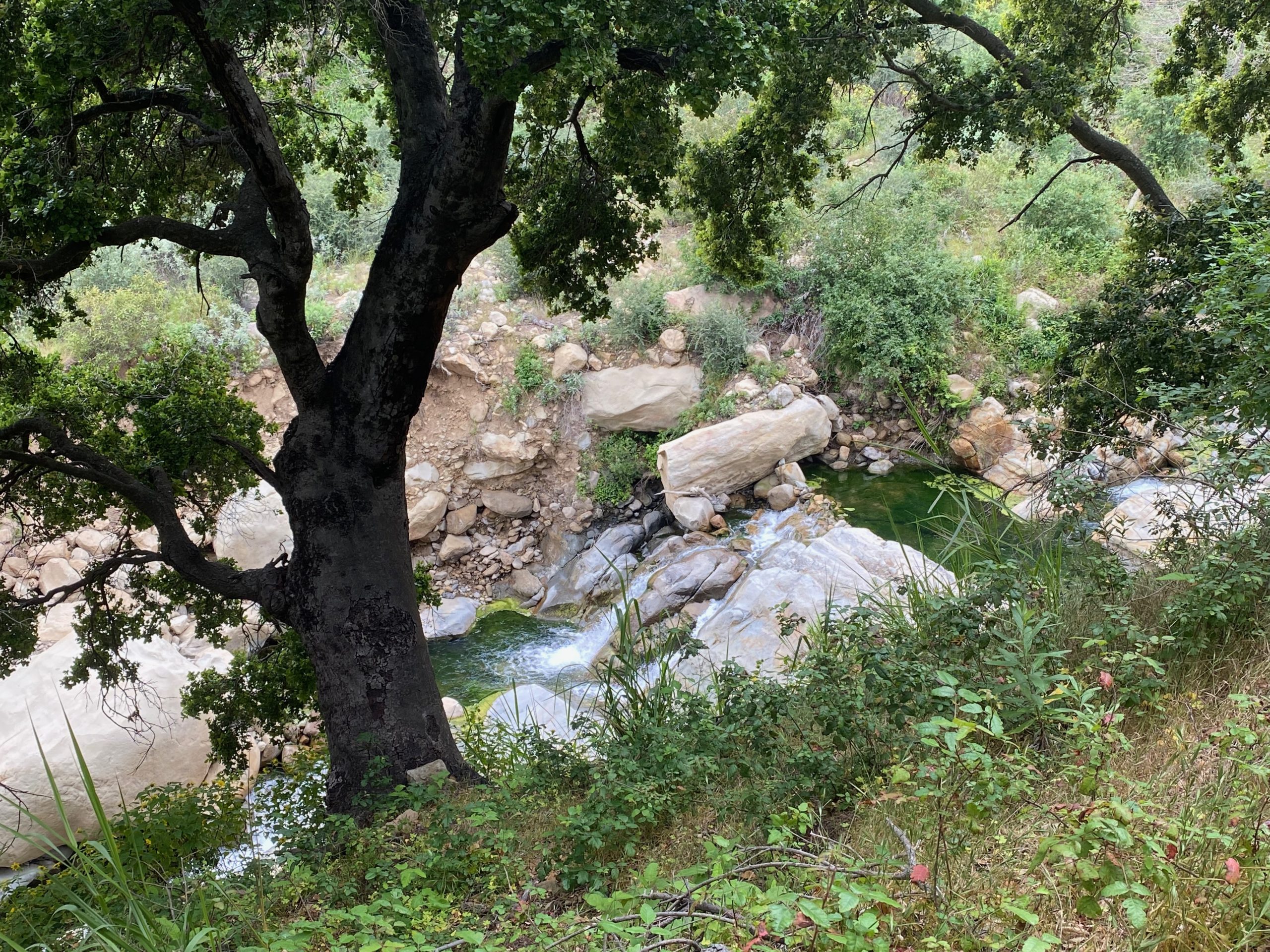 Suddenly, the hike opens up and transports you to a magical, nature-filled wonderland. Birds are singing, and lush greenery and overgrown (in a delightful way) chaparral shrubs keep you company as you wind your way alongside the rushing creek. Rule of thumb for this hike — if the creek is on your left, you’re going the right way. At this point, you also have great views of the mountains in the distance.