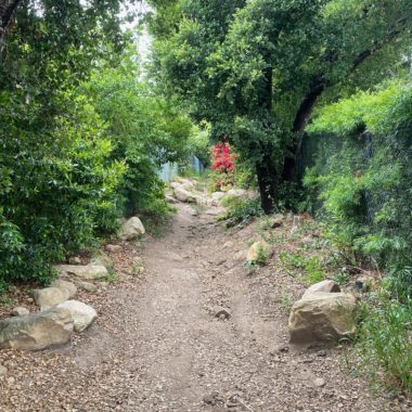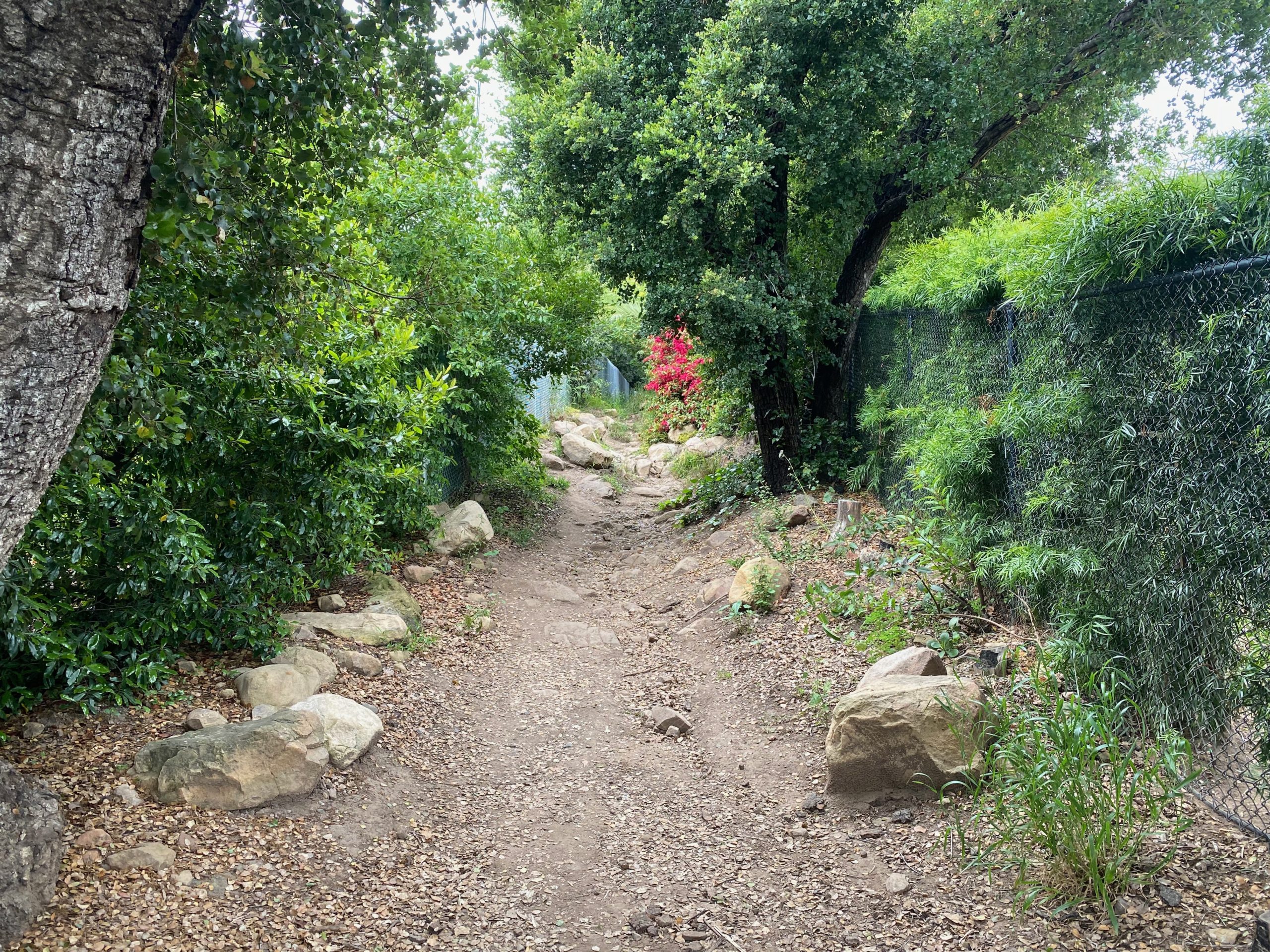 The path is narrow and rocky. You’ll walk with the fence on your left until you come to the main road and a fork. Keep left, and keep on keeping on (left, that is): where the main road turns back into a dirt road, where the trail signs continue, and by the chain link fence.