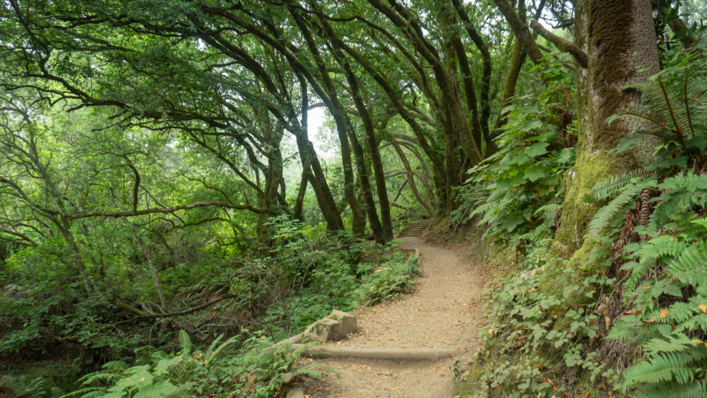 Wooden steps lead into a beautiful coastal forest. On your right, spot a stone mile-marker that says “Dipsea Race 7.” The Dipsea is a 7.4-mile annual race from Mill Valley to Stinson Beach. It is the oldest trail race in America, founded in 1905. In an unusual twist on conventional race rules, the slowest runners start first based on handicaps for age and gender. The fastest runners start last, in the back of a 1500-person pack, and must overcome the slower runners to win the race. In another twist, runners can take shortcuts through Mount Tamalpais to get to the finish—if they prefer to sprint up a steep hill versus taking a longer, flatter traverse, they can!