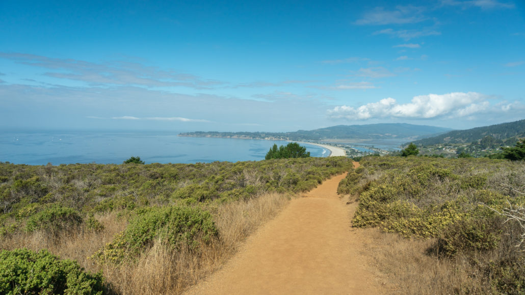 Emerging from the forest, climb southeast on a hillside of coast scrub. A gorgeous panorama of Stinson Beach and the Pacific Ocean comes into view at the 1.0-mile mark.