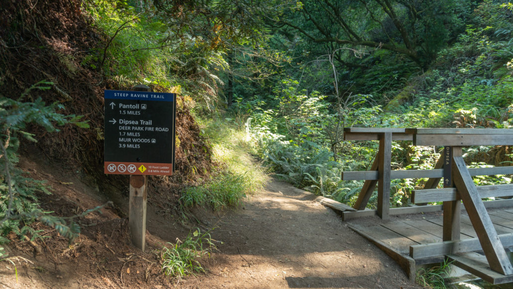 At the 1.5-mile mark, reach a junction for the Steep Ravine Trail and the Dipsea Trail. Stay straight onto the Steep Ravine Trail, continuing northeast towards the Pantoll Ranger Station. If you’d like to see the Dipsea mile-marker 6, it’s just across the wooden bridge on the other side of the creek.