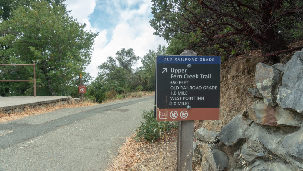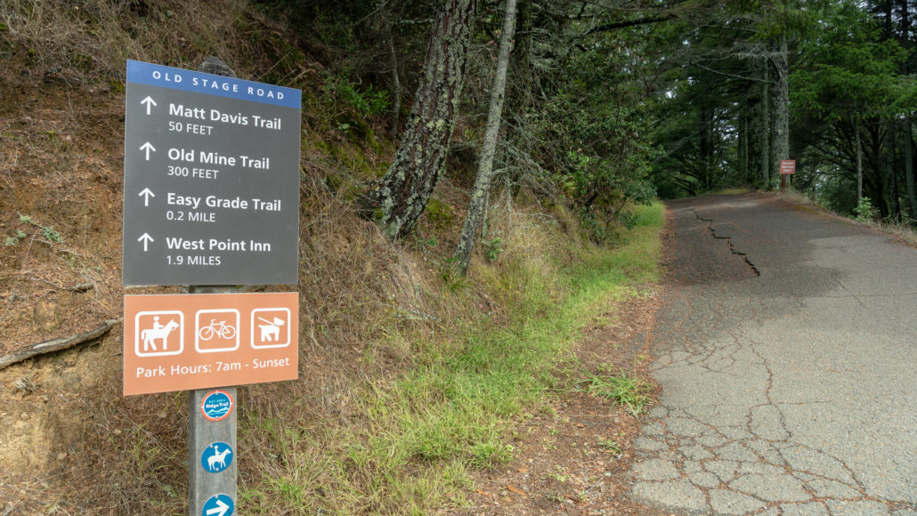 Past the ranger station, head straight up the driveway towards Panoramic Highway. Carefully cross Panoramic Highway to pick up Old Stage Road, heading northeast for 1.9 miles towards West Point Inn. Old Stage Road is a multi-use trail popular with mountain bikers; you will likely see several zooming down the mountain as you climb.