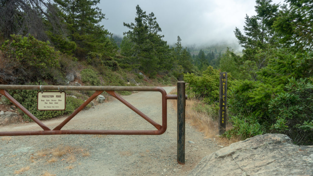 When you’re ready to head to the summit, hop on Old Railroad Grade around the left (western) side of Inn for 1.7 miles towards East Peak. Keep an eye out to the northeast for views of the fire lookout at East Peak among shrubby green chaparral.