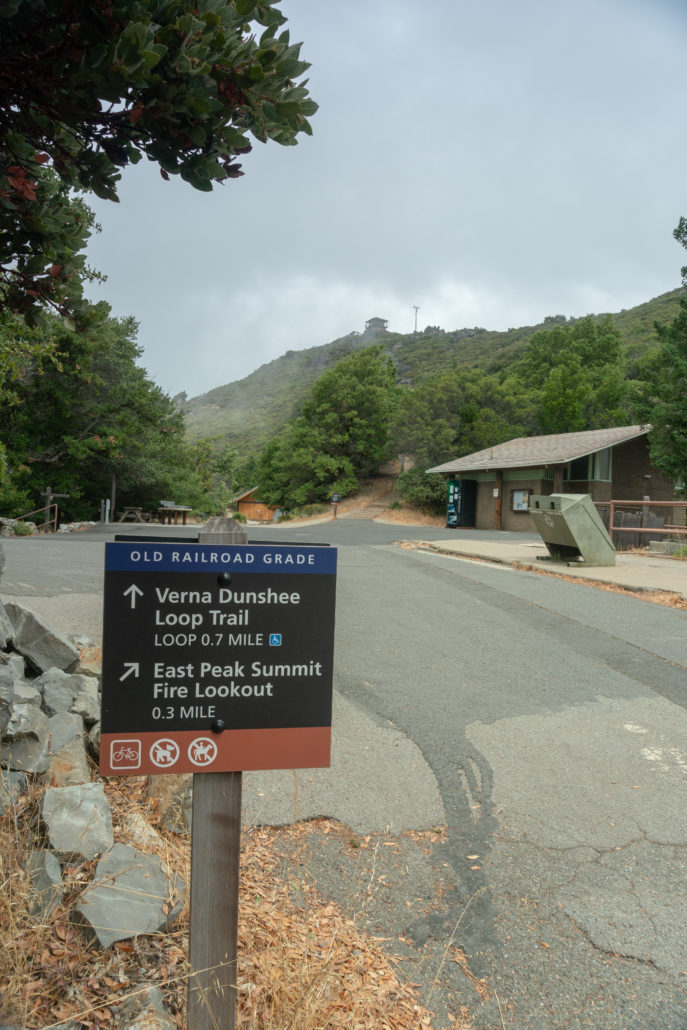 In another 0.3 miles, arrive at a welcome area just below East Peak. The small house-like structure beyond the main display is the Gravity Car Barn, which contains a replica of the gravity cars that used to transport 30 people at a time to Muir Woods in the early 1900s. There are also educational displays, restrooms, and a vending machine with drinks. The Verna Dunshee Trail is flat and paved 0.7-mile trail encircling East Peak.