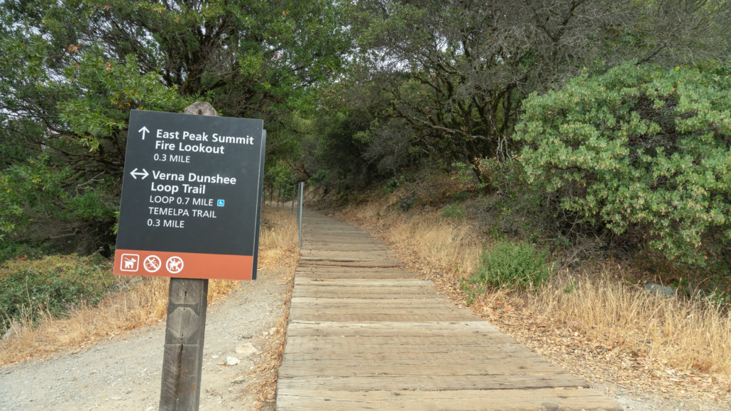 In 0.3 miles, the teeny tiny fire lookout is visible to the northeast on clear days. There’s also a nice view southeast to Mount Diablo, the San Francisco Bay Bridge, Treasure Island, Angel Island, and Alcatraz Island.
