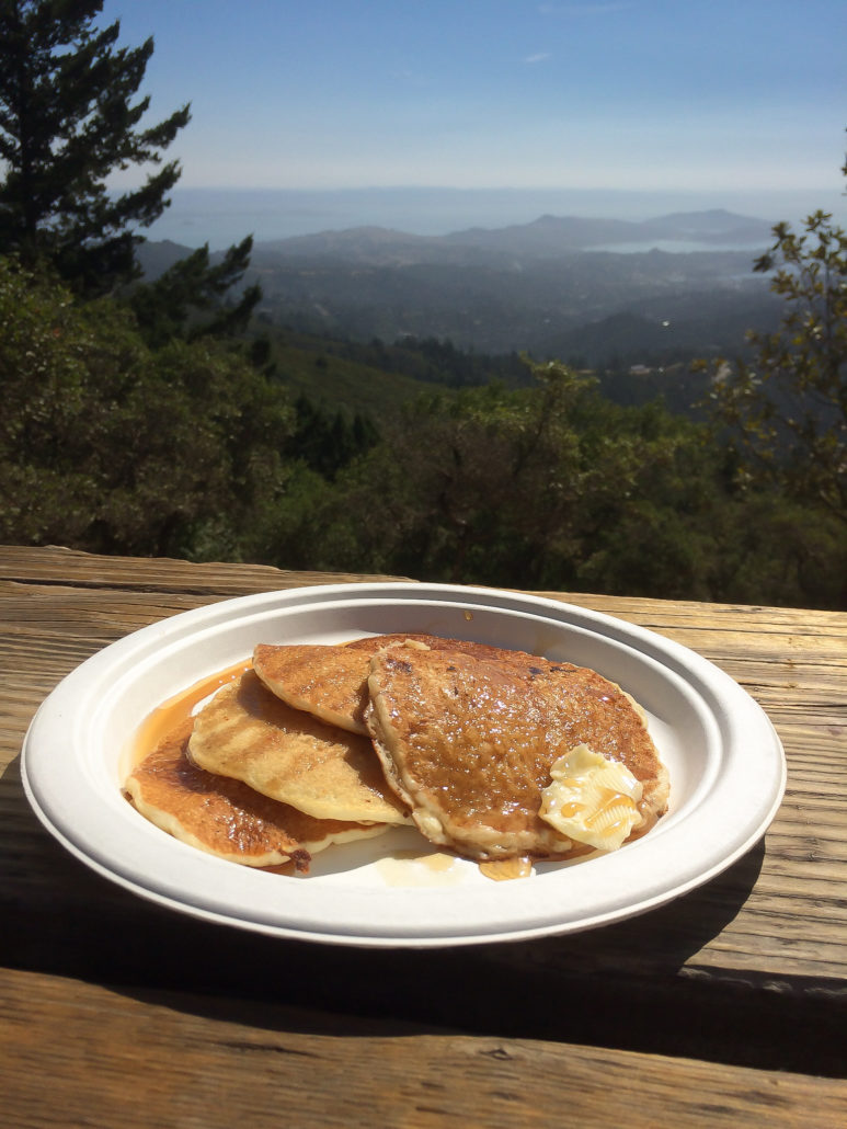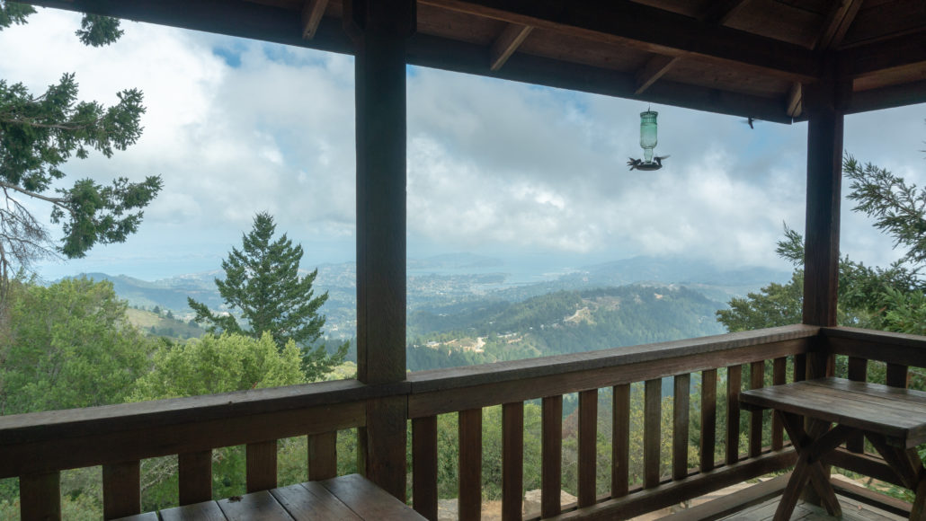 At the 5.1 mile mark, arrive at West Point Inn. Head up the stairs to take a break on the wrap-around porch. Hummingbird feeders, picnic tables, and rocking chairs overlook the slopes of Mount Tamalpais and San Francisco Bay. Inside the Inn’s main entryway to the left is a modest hiker store with granola bars, hot water, tea, cocoa, and more for purchase. It’s run on the honor system, so drop a buck (or whatever the suggested price is for the item you’d like) in the labeled buckets and help yourself. Proceeds go towards maintaining the Inn.