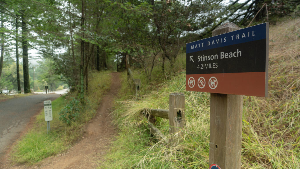 Back on the Matt Davis Trail, carefully cross Pantoll Road to stay on the Matt Davis Trail towards Stinson Beach. The next 1.7 miles are a rolling westward traverse, gently climbing 200 feet. The trail alternates between grasslands and beautiful evergreen forests.