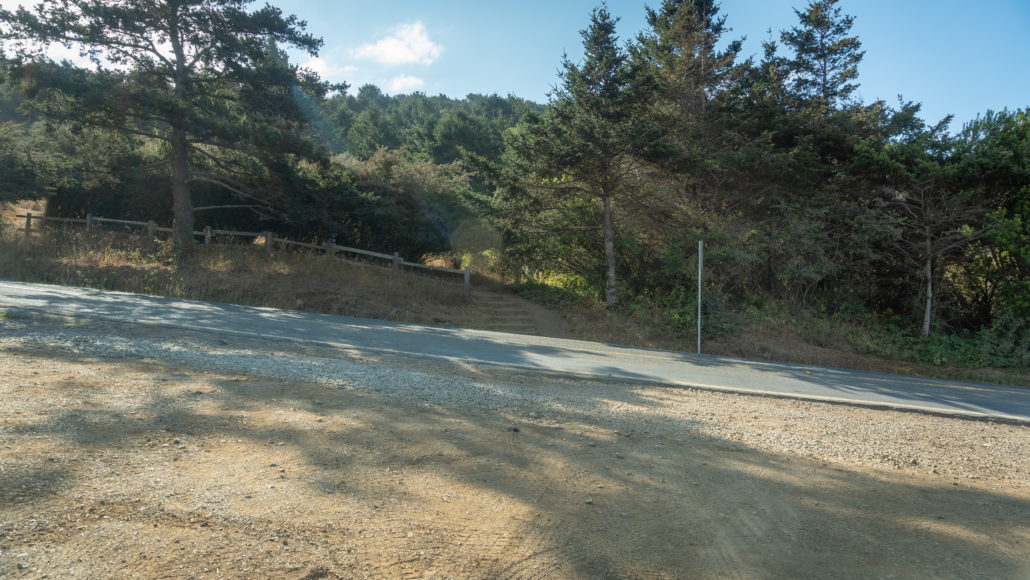 Ascend 0.1 mile though pine trees and blackberries, emerging on a wide parking shoulder off Panoramic Highway. This is a good parking alternative for this hike (see Notes below for details).