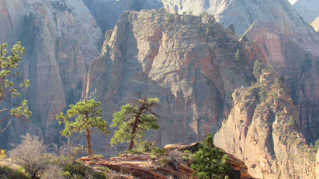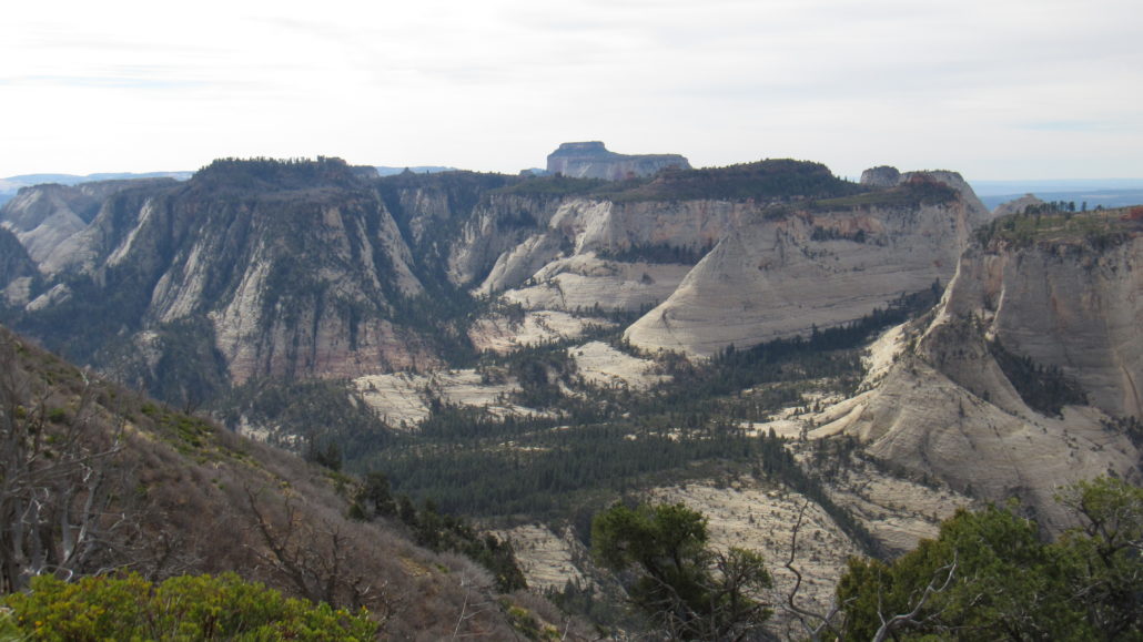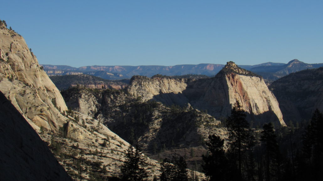After campsite 3, the West Rim Trail begins its final descent into Zion Canyon. The West Rim Trail takes a hard bend to the east as it descends, which opens up views directly across (but rarely into) Zion Canyon. Seldom viewed landmarks such as Lady Mountain, Castle Dome, and Cathedral Mountain look much less like mountains and more like the sky island plateaus that they truly are. You can peer into some of the canyons, sometimes all the way into Zion Canyon below. These deeply carved canyons testify to the impact that water and time has had on this landscape.
