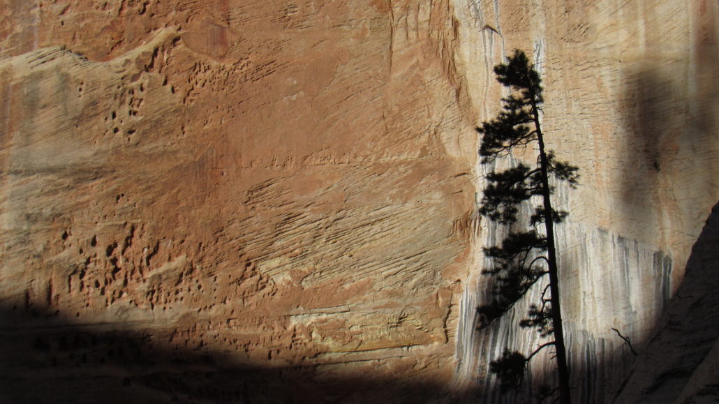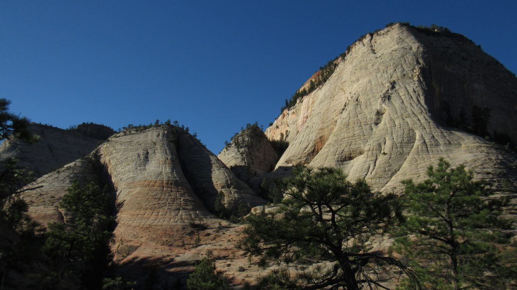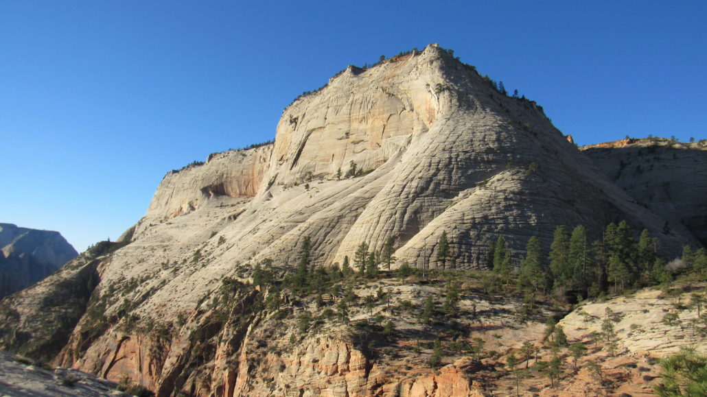 Keep right on the West Rim Trail and begin descending more vigorously as the trail descends through a gleaming white layer of Navajo sandstone on a trail cut directly into the side of the cliff. This trail switchbacks down to a saddle at the head of Behunin Canyon before continuing to descend along the north cliffs of Mount Majestic. This cool, north-facing slope lies in the shade through most of the day, especially during the fall and winter. Ice and snow may be present here even when it’s absent anywhere else. Be prepared at least for a sudden drop in temps and perhaps treacherous trail conditions if the weather has been inclement recently.