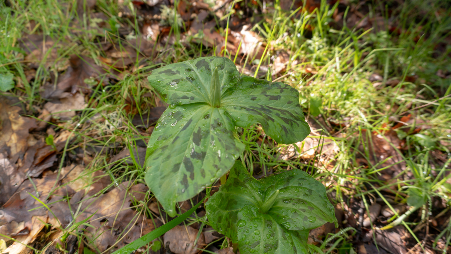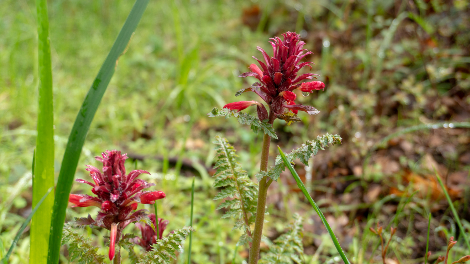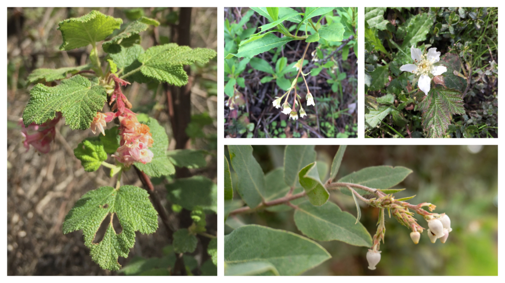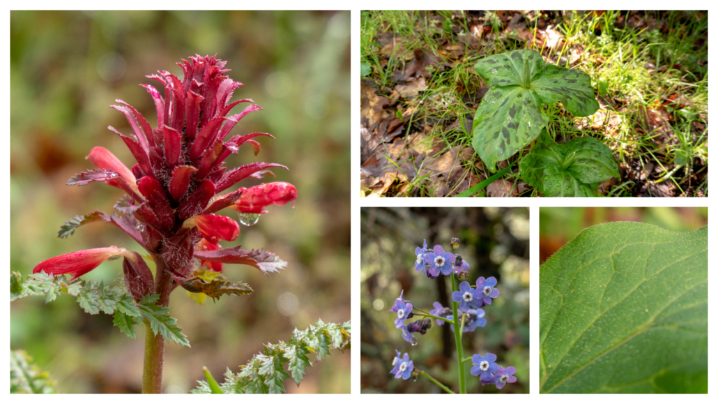 In late winter and spring, the mottled leaves and deep cranberry-colored flowers of giant wake robin (Trillium chloropetalum) bloom. Its genus, Trillium, refers to the plant’s three leaves and three flower petals, and the species chloropetalum is a nod to the hint of green in some of the flowers’s petals. Purple-blue western hound’s tongue (Cynoglossum grande) mixes with dark pink warrior’s plume (Pedicularis densiflora). Gently feel the leaves of the hound’s tongue—the tiny hairs on it make it feel rough like a dog’s tongue.