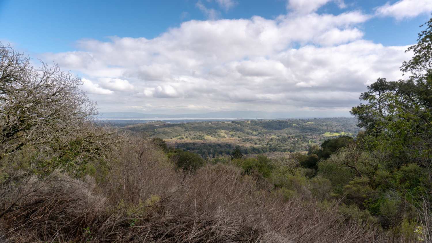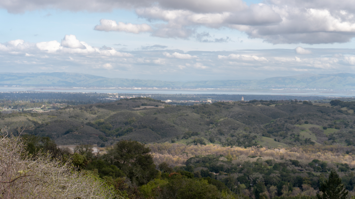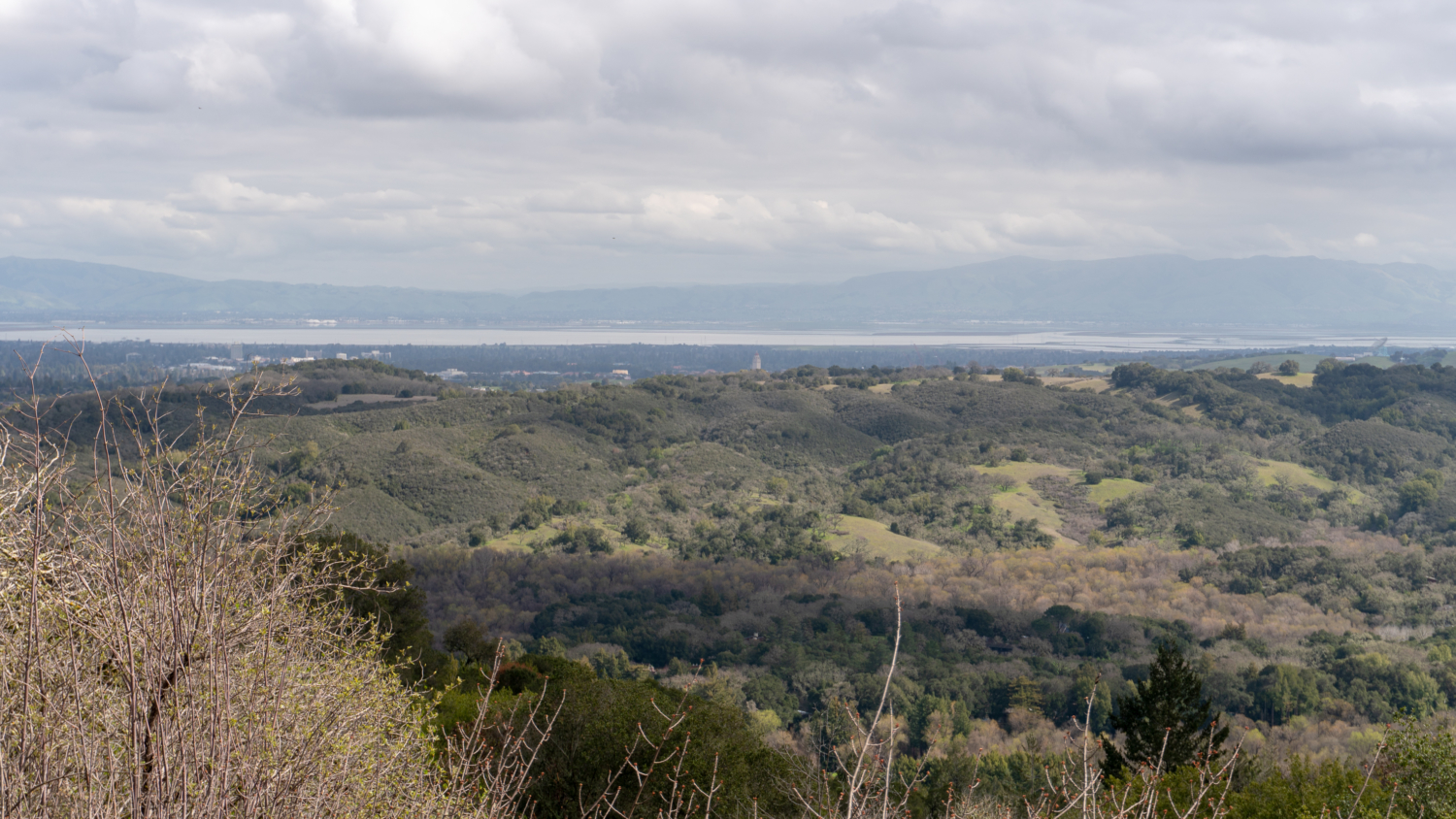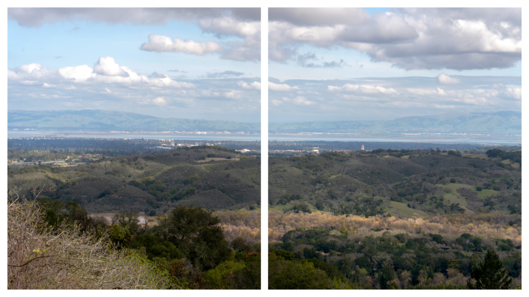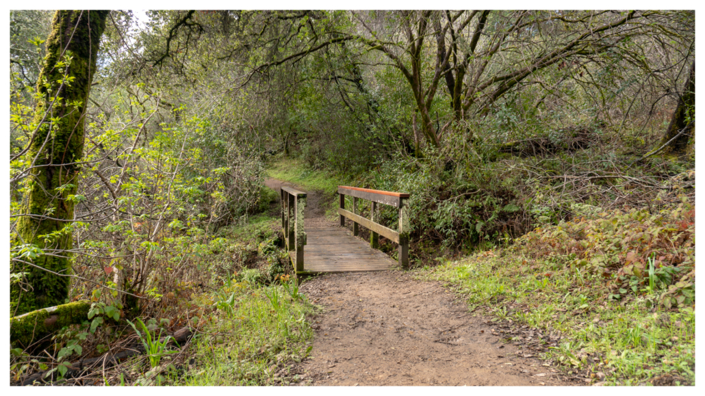 In a quarter mile, the partial tree cover releases into bright, sun-on-your-face hiking. Palmate buckeye and hairy kings mountain manzanita crop up on the woods’ periphery. An opening to the northeast reveals Jasper Ridge, Palo Alto, Stanford’s Hoover Tower, the San Francisco Bay, and Mission Peak. Back on the trail, a lichen-covered wooden bridge crosses one of the many small creeks in the preserve.