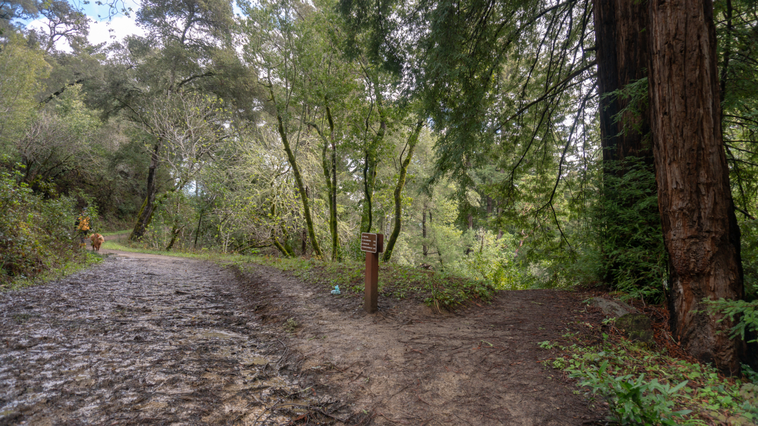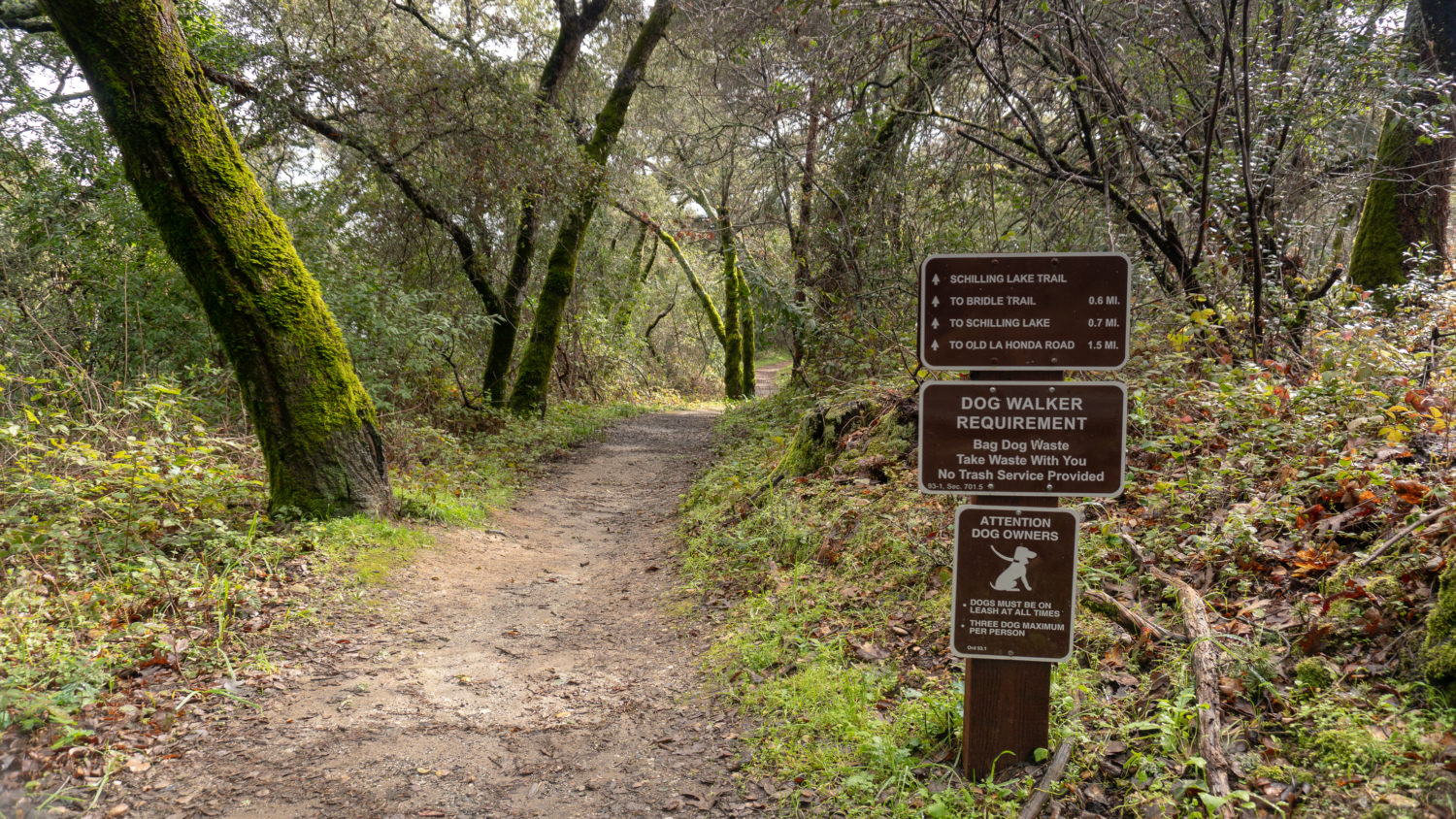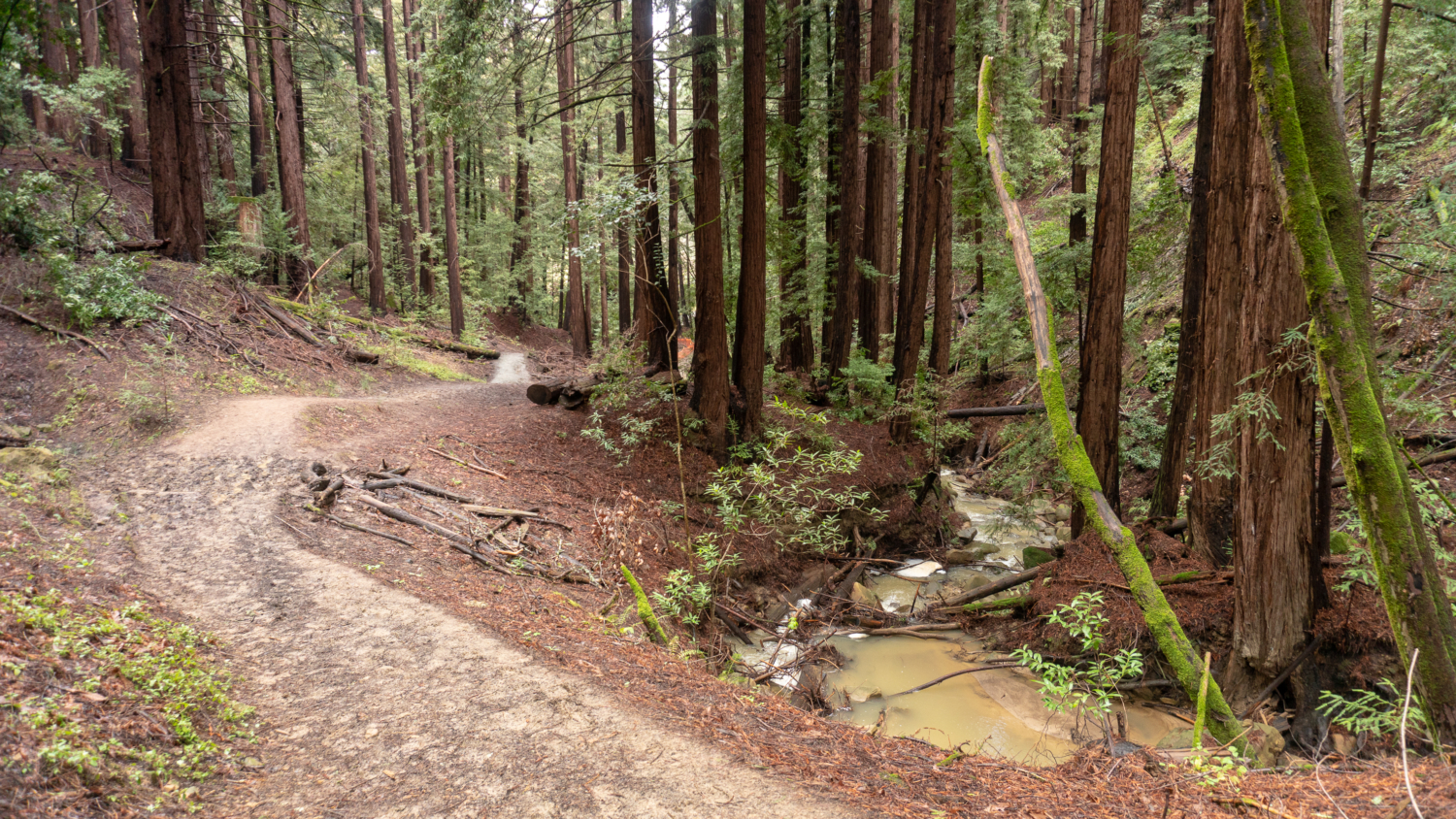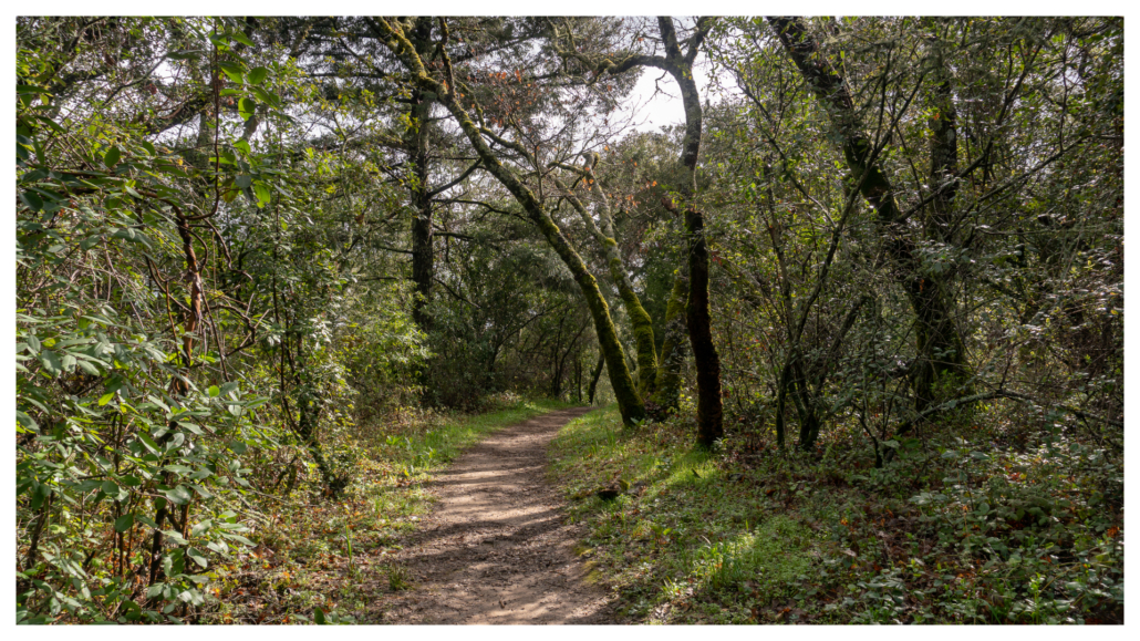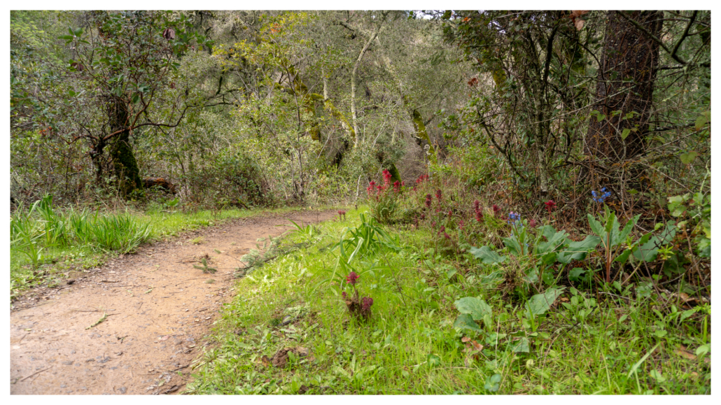 On the Schilling Lake Trail, step into madrone, Douglas fir, and live oak forest. In winter, the toyon’s red berries pop against the greenery, hence its other common name: Christmas berry. Mossy tree trunks sprout along the trail, trickling streams flow beneath the trail through culverts, and Steller’s jays quack-chirp among blackberry, coffeeberry, tangled branches, and partial sky. The wide single-track is fairly level for the first half mile and then descends to Schilling Lake and Dennis Creek.