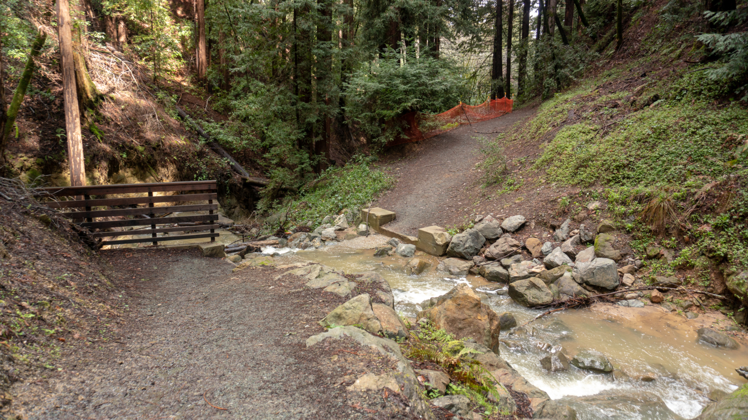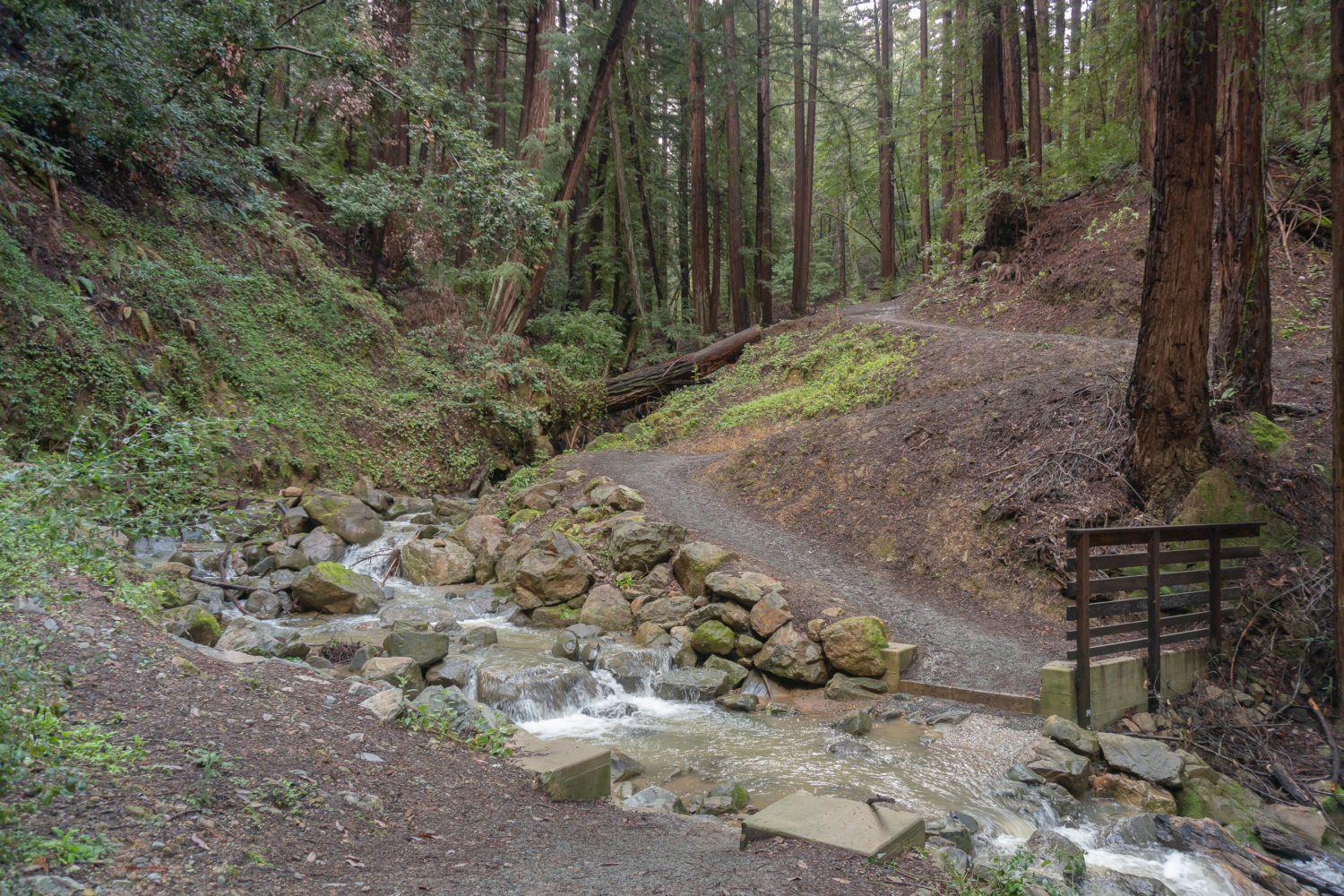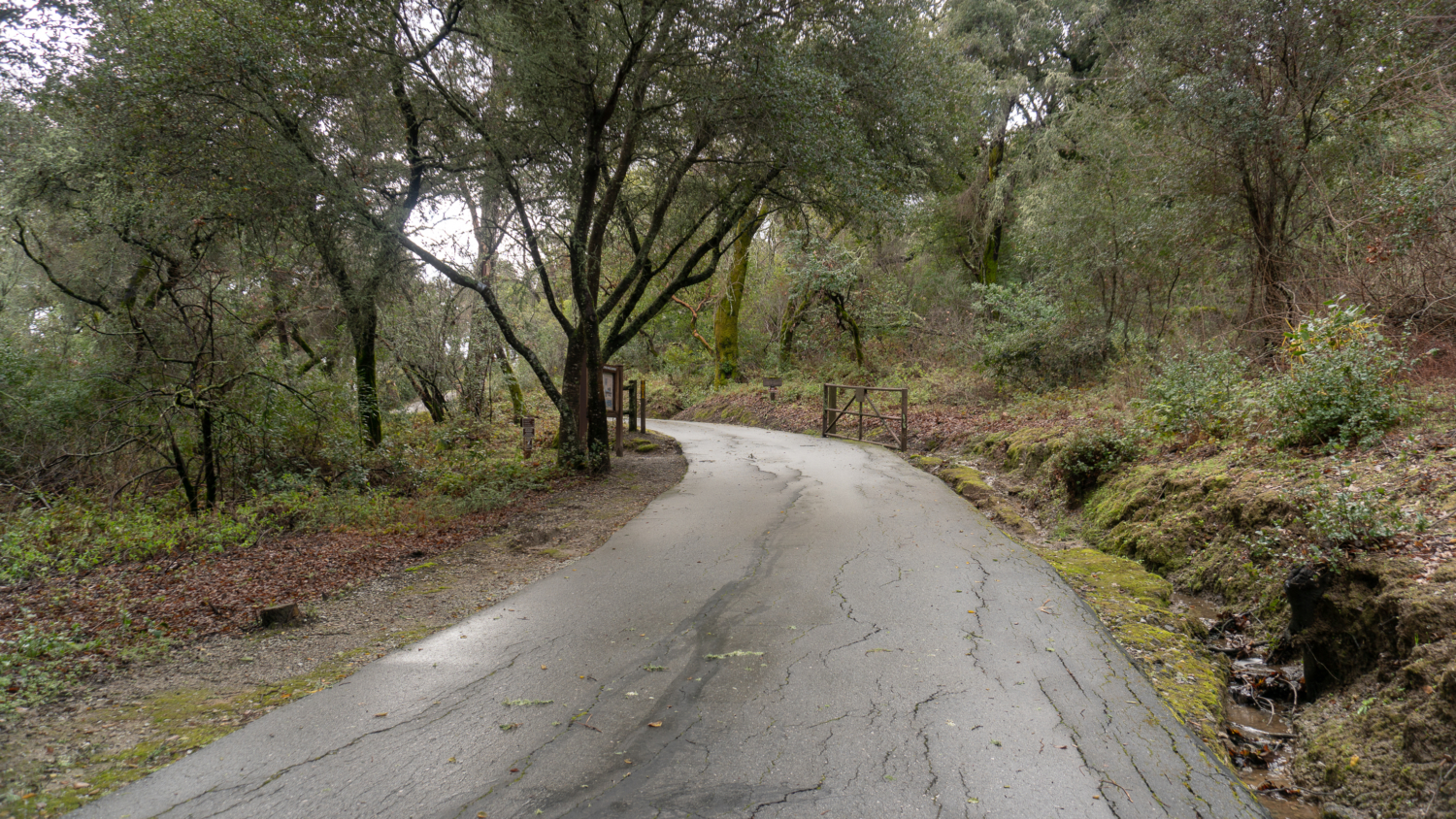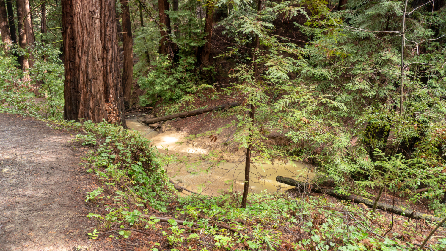On the Schilling Lake Trail, step into madrone, Douglas fir, and live oak forest. In winter, the toyon’s red berries pop against the greenery, hence its other common name: Christmas berry. Mossy tree trunks sprout along the trail, trickling streams flow beneath the trail through culverts, and Steller’s jays quack-chirp among blackberry, coffeeberry, tangled branches, and partial sky. The wide single-track is fairly level for the first half mile and then descends to Schilling Lake and Dennis Creek.