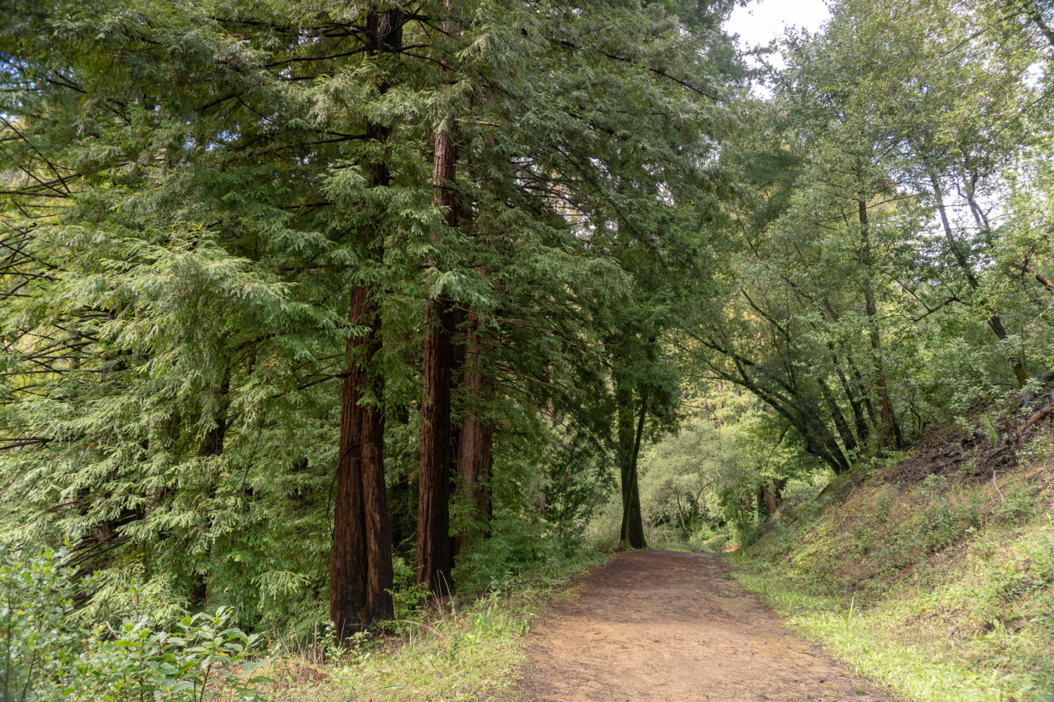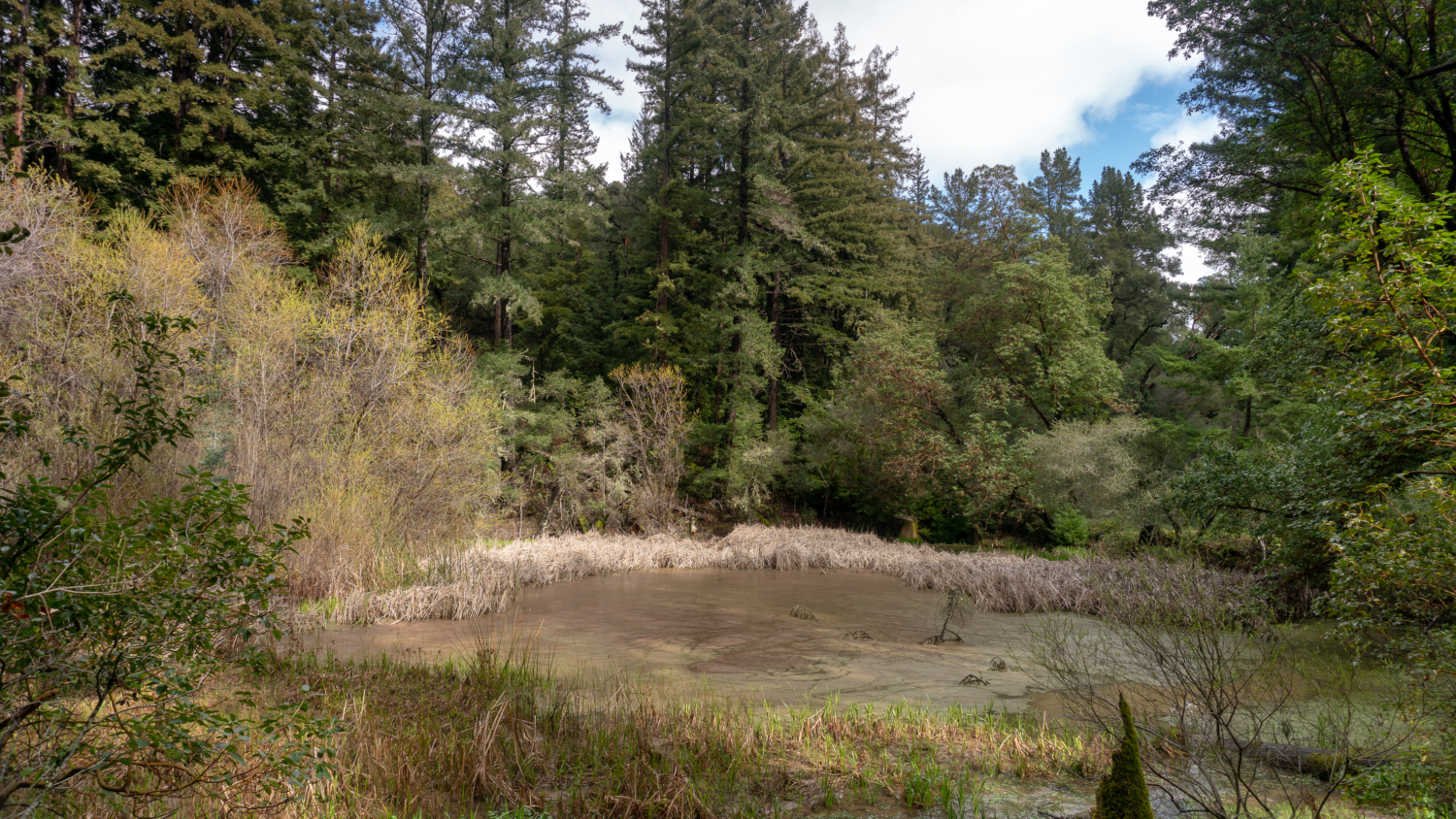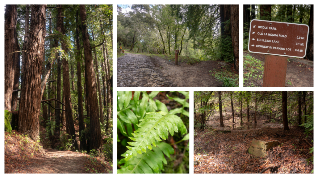 The habitat dramatically transforms into a redwood forest here, with wild strawberries and dainty milkmaids lining the understory. The trail curves in a U-shape past residential driveways and preserve signs to Schilling Lake. Although you may see herons and ducks, the “lake” is more like a marshy pond.