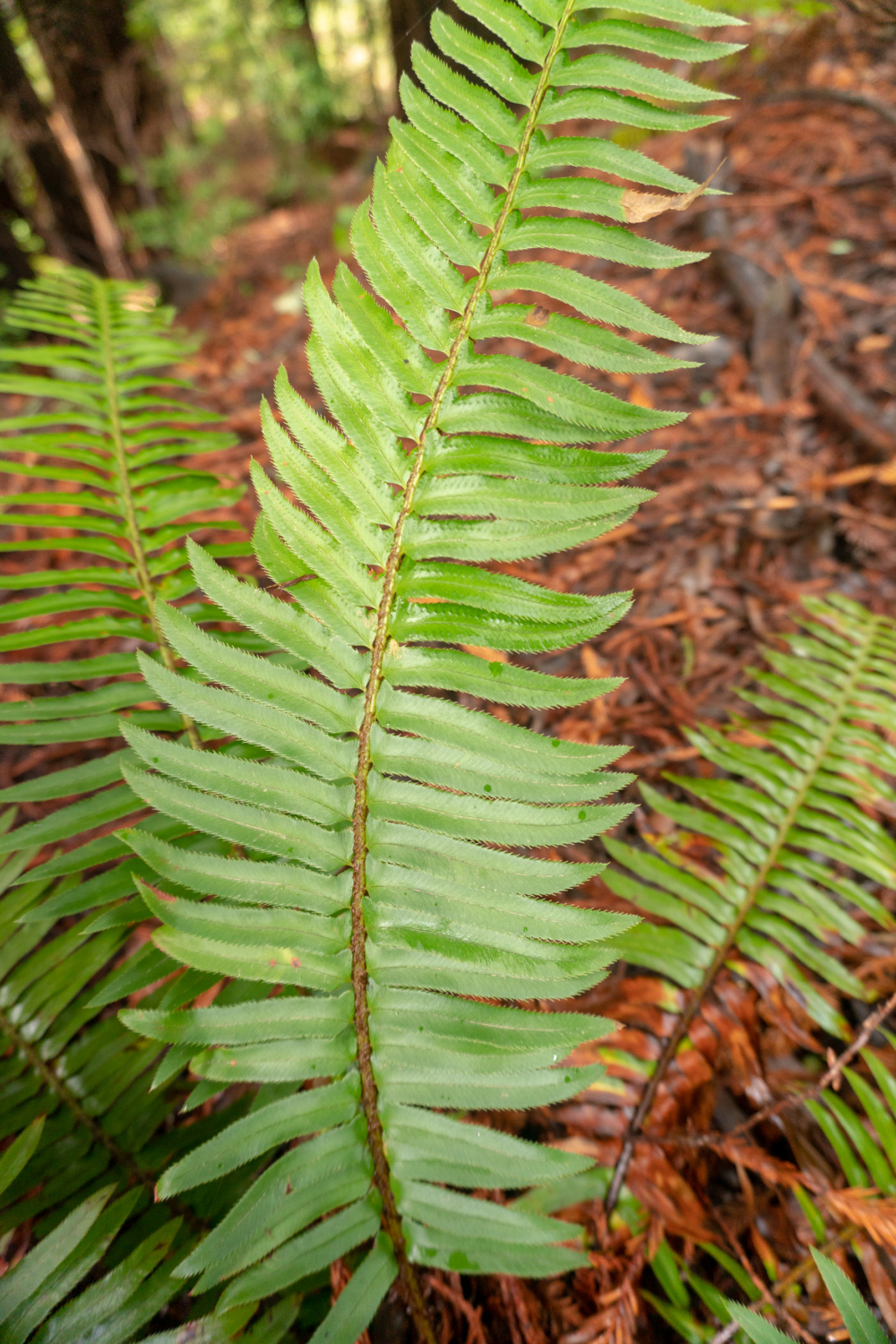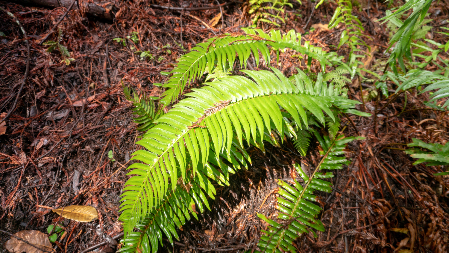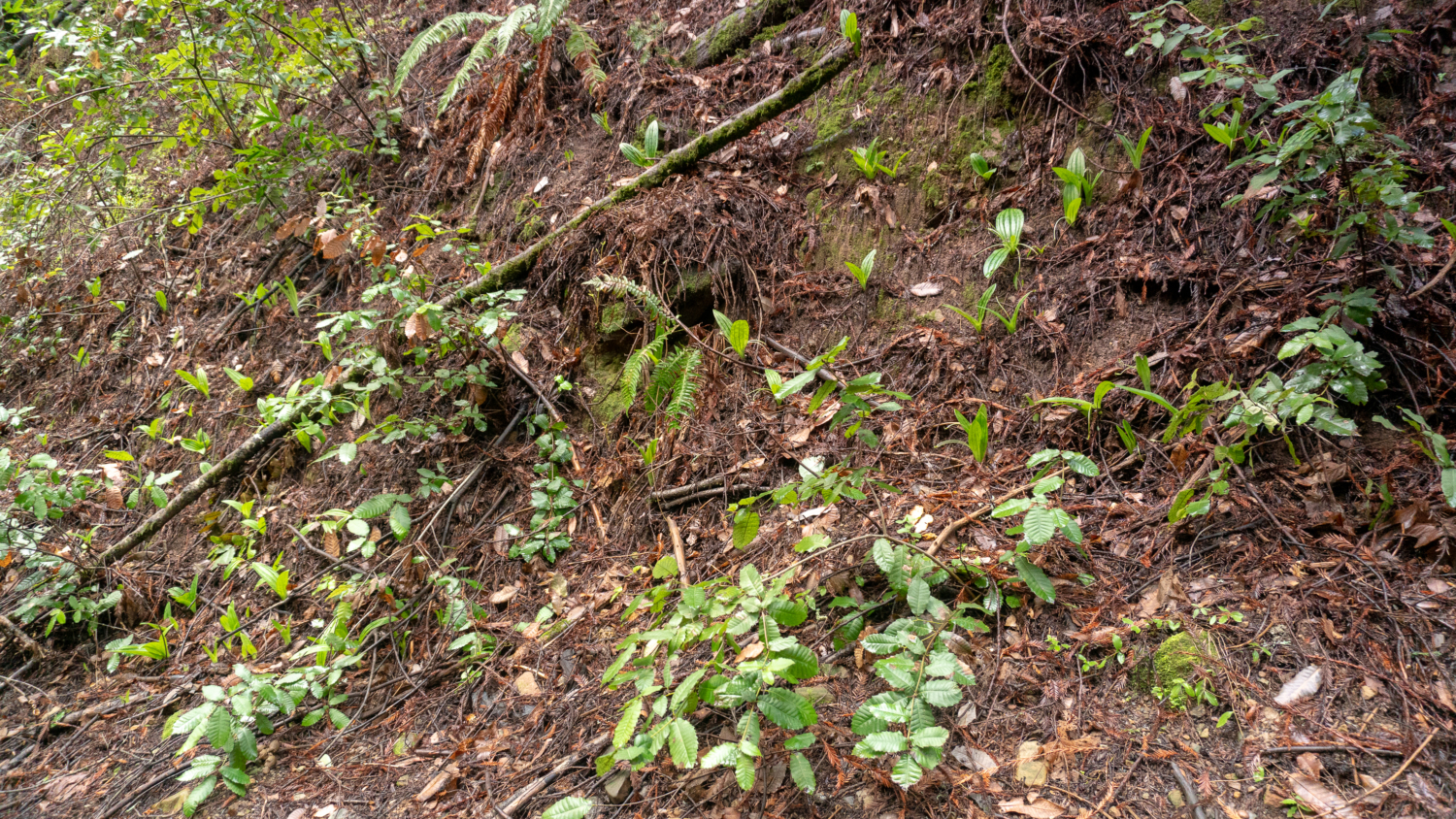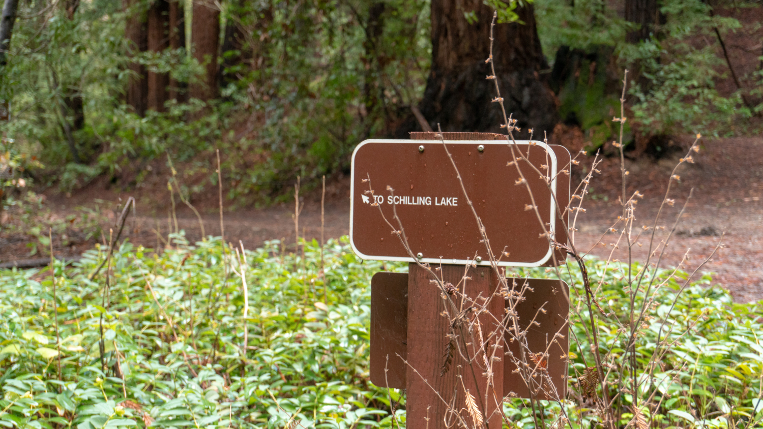 At 0.5 miles, merge onto a wide dirt road towards Schilling Lake. The sloping hillsides burst with coast wood fern, goldback ferns, and wood rose. Pass Bridle Trail on your left, staying straight towards Schilling Lake. We will come back to Bridle Trail in a moment.