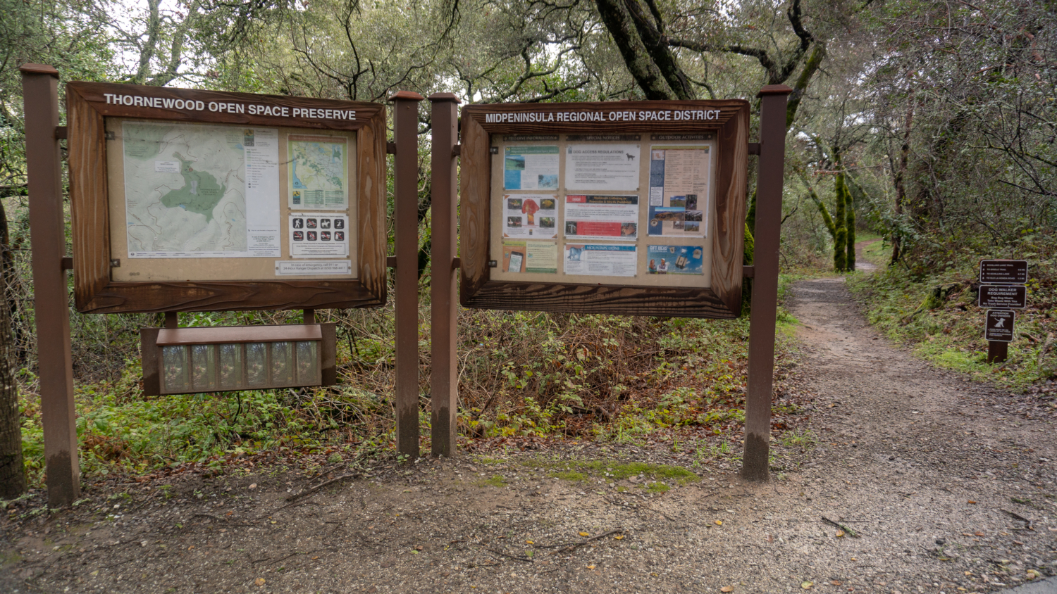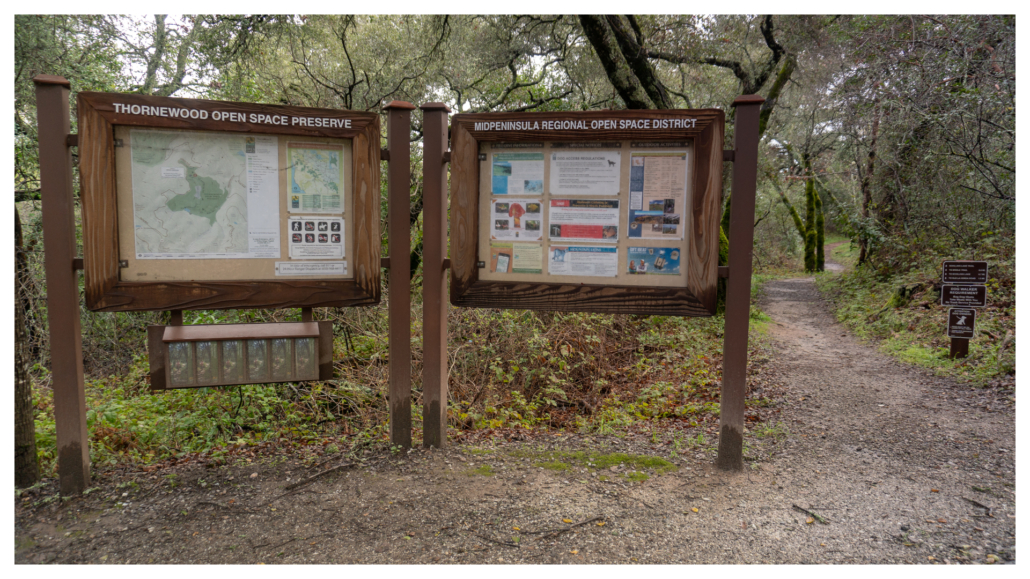 Begin your hike at the Midpeninsula Regional Open Space District kiosk and trailhead, heading south on the Schilling Lake Trail towards Schilling Lake. To your right are a private road and the former Thornewood house, which is currently leased to a private party and undergoing restoration. It is closed to the public at this time, but you can check in with Midpen for updates.
