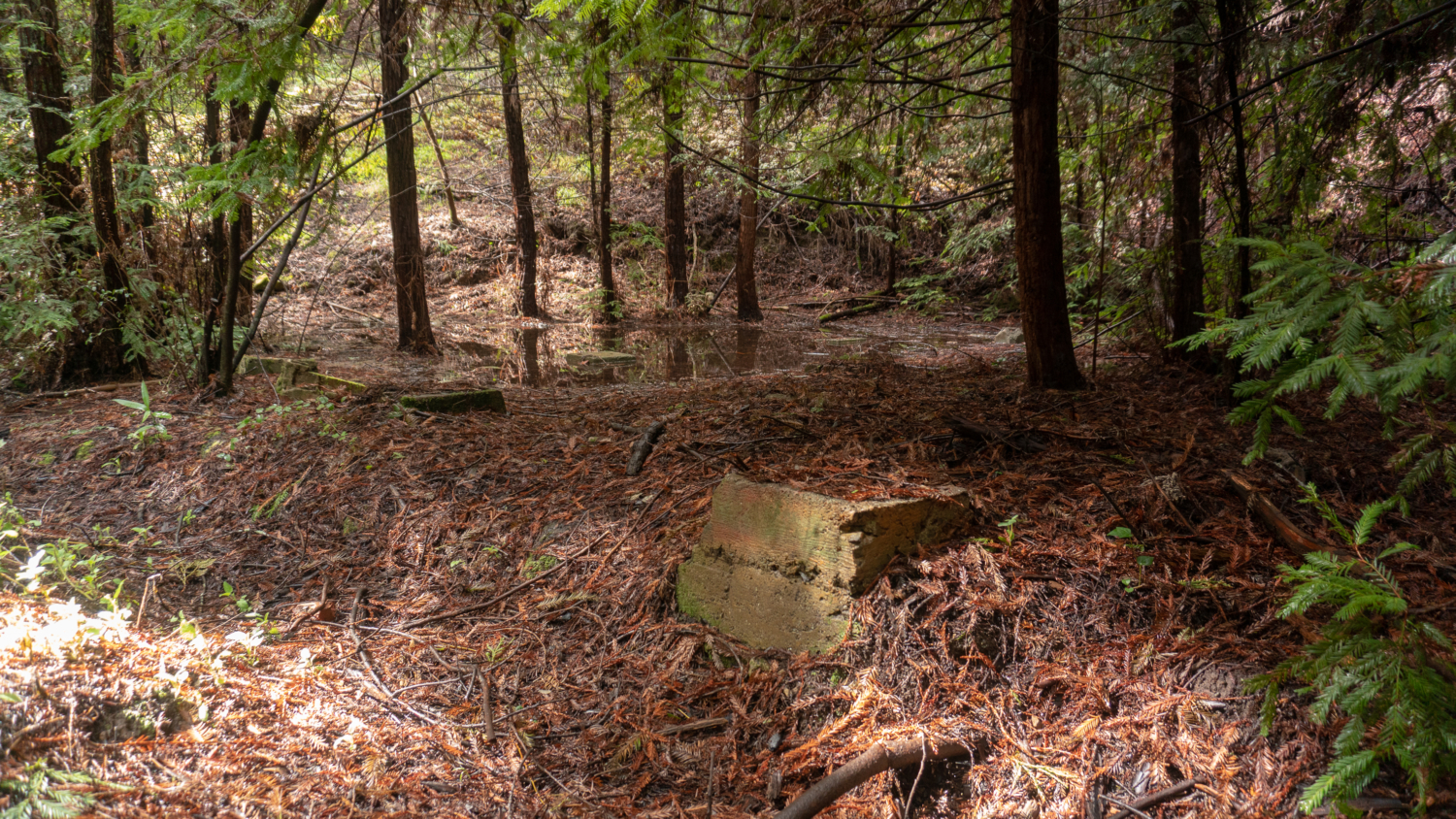 Julian Thorne passed away in 1930 and years later, when Edna passed, she left their land to the Sierra Club Foundation, who in turn donated it to Midpen in 1978. In the years that followed, Midpen acquired part of the Schilling estate and leased 10 acres of the former Thorne estate, including the Thorne’s summer home, to a private party for restoration. For many years, the main trail in the preserve was the Schilling Lake Trail to Schilling Lake. Then in May 2009, Bridle Trail opened along Dennis Martin Creek, officially adding 0.75 miles to the preserve as well as an alternate entry point via Old La Honda Road. The name “Thornewood” is a nod to the Thorne family; Schilling Lake a nod to the Schillings; and Dennis Martin Creek, whose tragic history I will get into below, honors Irish pioneer Dennis Martin who built sawmills along the creek to harvest redwoods.