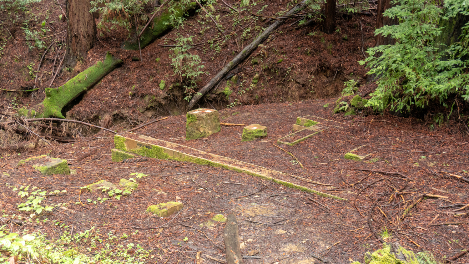 Retrace your steps to Bridle Trail and turn right, zigzagging east and losing 400 feet over the next 0.7 miles. Second-growth redwoods stretch above a shady forest floor of ferns, California bay, and shrubs: new growth in a ravine that was once logged in Dennis Martin’s lumber enterprise in the 1850s. It is possible the concrete remains you see next to the trail are the remains from his sawmill operation, or perhaps August Schilling’s estate.
