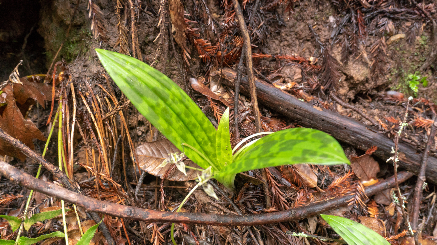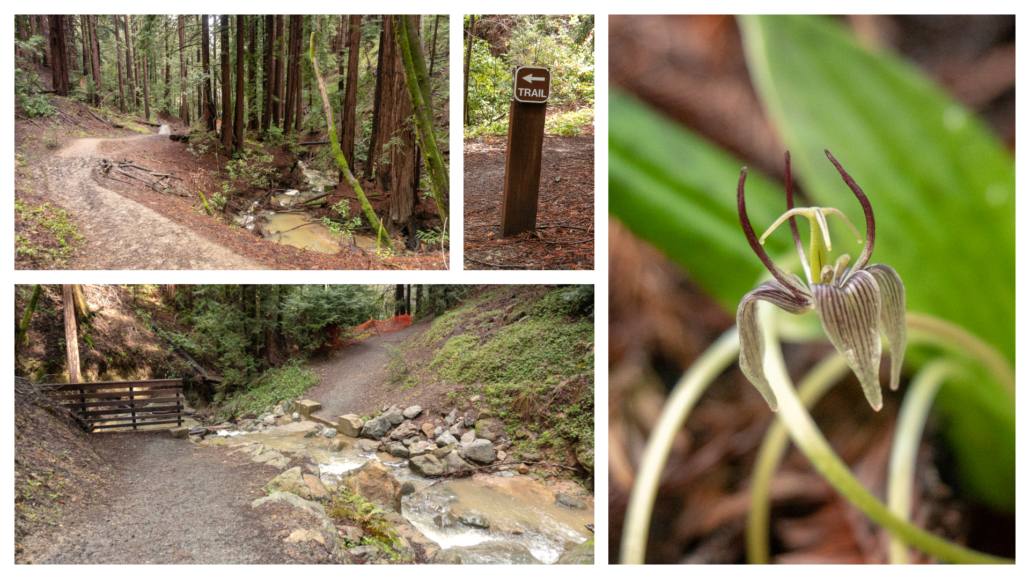 At 1.5 miles, a Trail sign points the way to continue on Bridle Trail next to Dennis Martin Creek. Here the creek parallels the trail with photogenic cascades. After crossing the creek next to a wooden barrier, keep a sharp eye out on your right for fetid adder’s tongue (Scoliopus bigelovii), a tiny flower with purple and white striped sepals and dark, fishing hook-like purple petals. If you lean in very close, being careful not to crush the flower, you can get a whiff of its cloudy, off-putting smell that’s used to attract the fungus gnats that help pollinate it. It is one of the year’s earliest flowers and typically blooms in February.