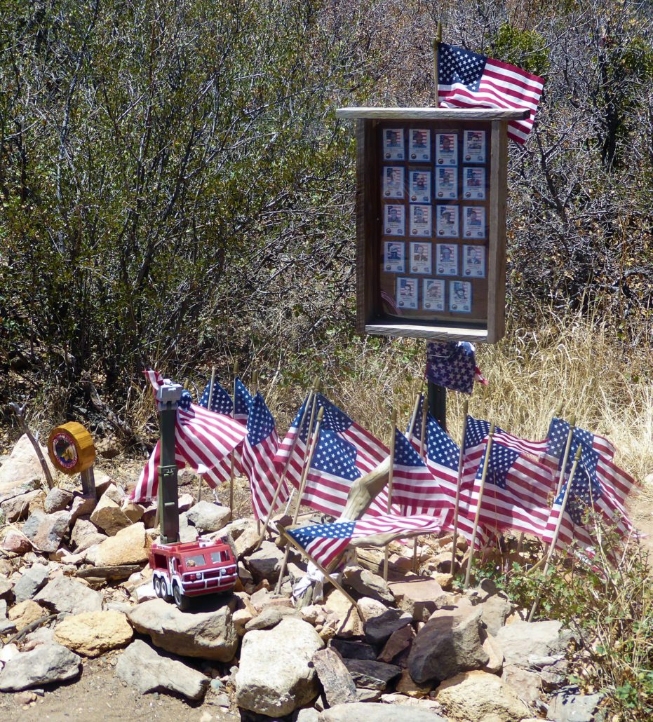 At around, 1.1 mile you will come to a forked section of the trail. There are no trail signs, but you will want to stay to the left. It is after this curve that there is a memorial in honor for the fallen 19 Prescott Hotshots, who tragically lost their lives in a wildfire.  Another hiking trail, known as the Hotshots & Journey Trail also honors these heroes and allows hikers to walk the same trail these men walked on that fateful day.