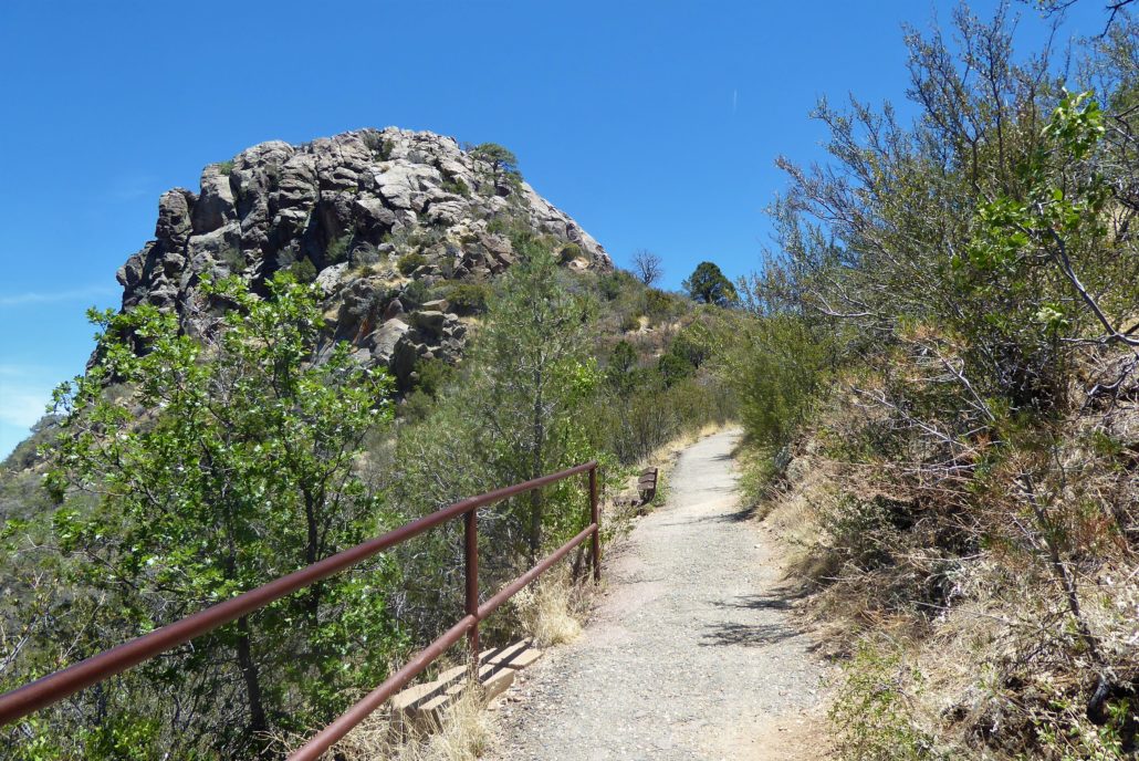 After passing the memorial you will get a close-up view of the Thumb Butte, sticking out of the mountain. As you approach closer the trail will now turn into a paved surface with metal railings along the side. From this butte side of the mountain, you will be able to see the gorgeous surrounding mountains.