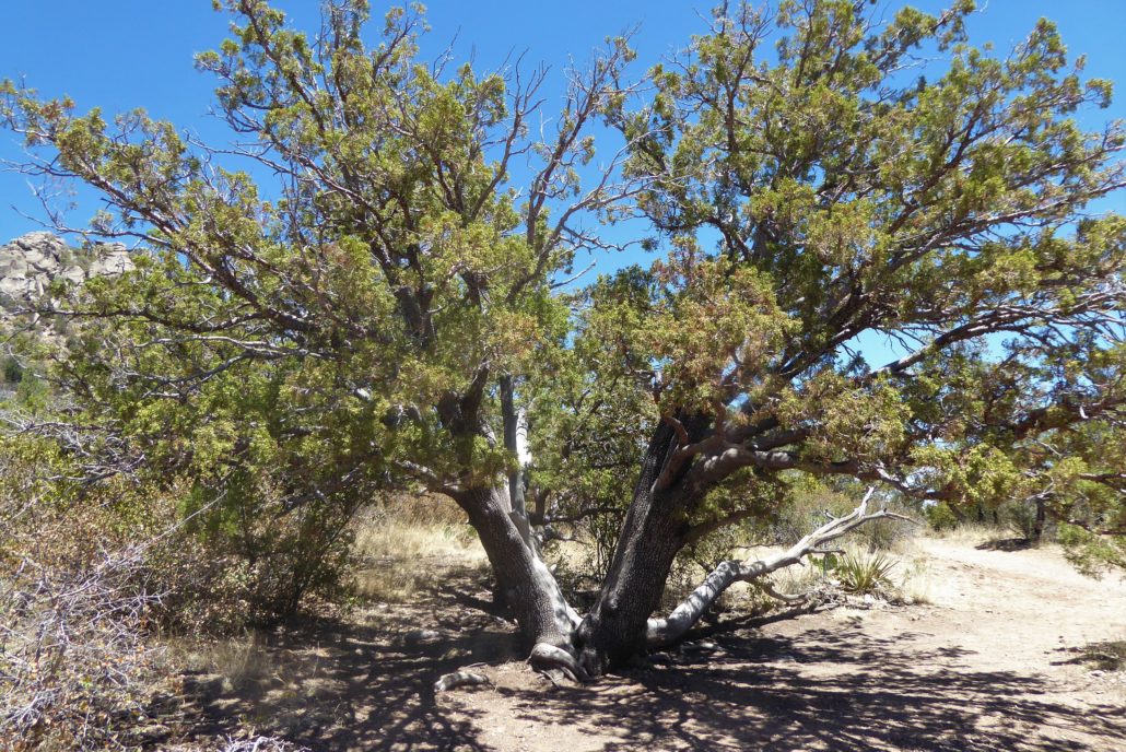 Along the trail, there are also some plaques with information about the wildlife and vegetation in this area. One tree that will be sure to grab your attention is the alligator juniper tree. These junipers range from central Mexico to central Arizona and New Mexico and tend to grow in dry, high altitudes. You’ll figure out how it got its name once you take a look at its distinctive bark: