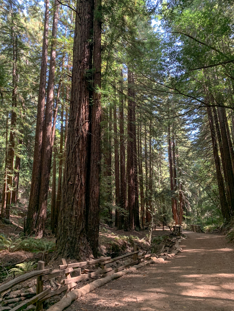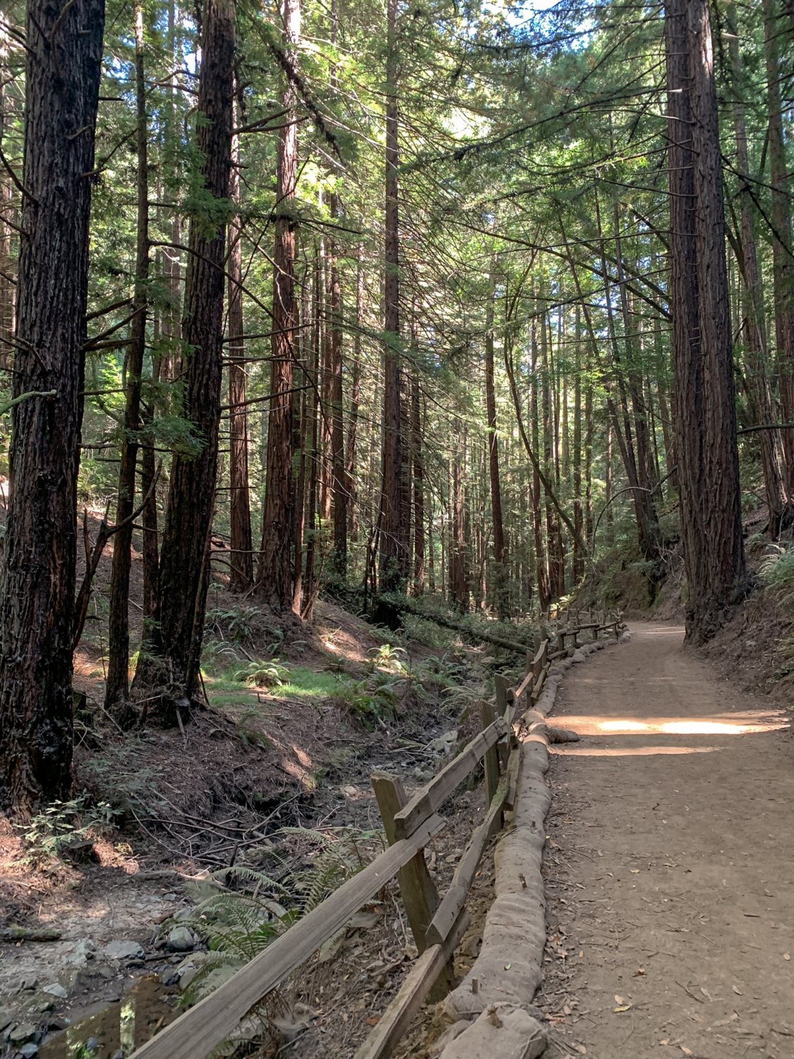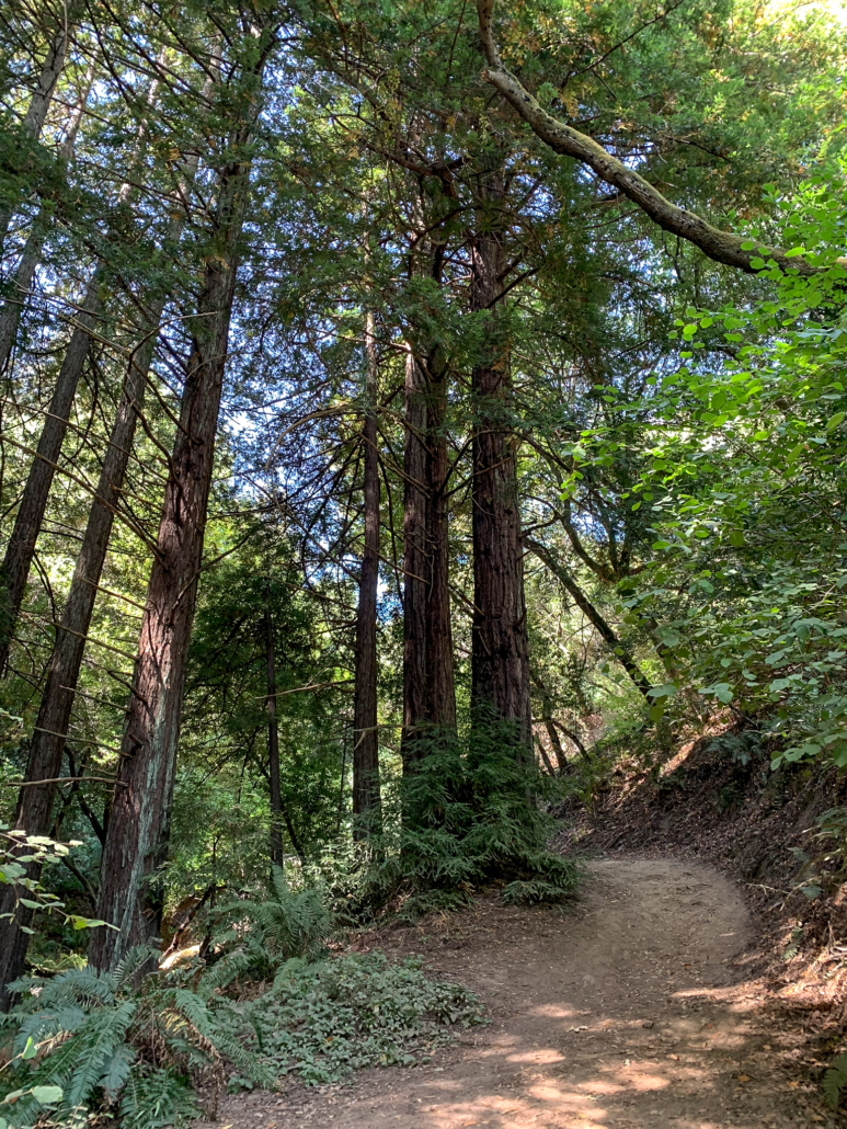 Tall coast redwoods appear just as the Orchard Trail steepens.